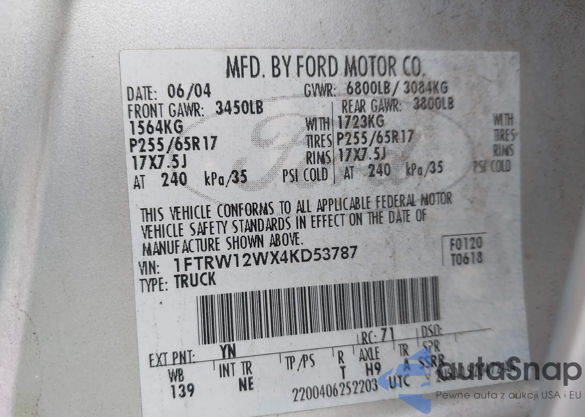 • VIN 1FTRW12WX4KD53787