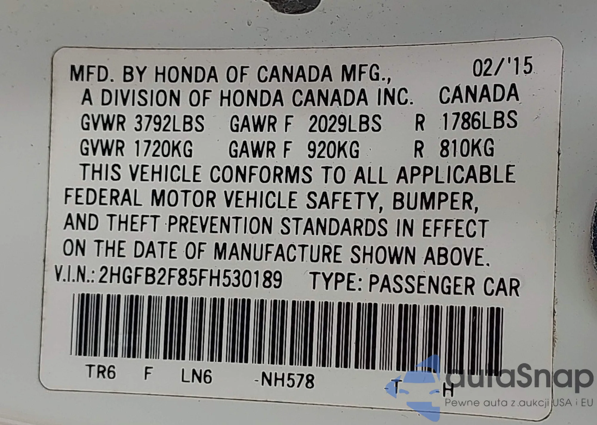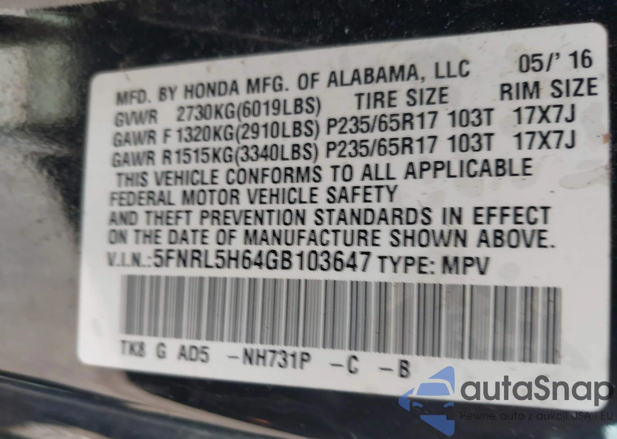 • VIN 5FNRL5H64GB103647