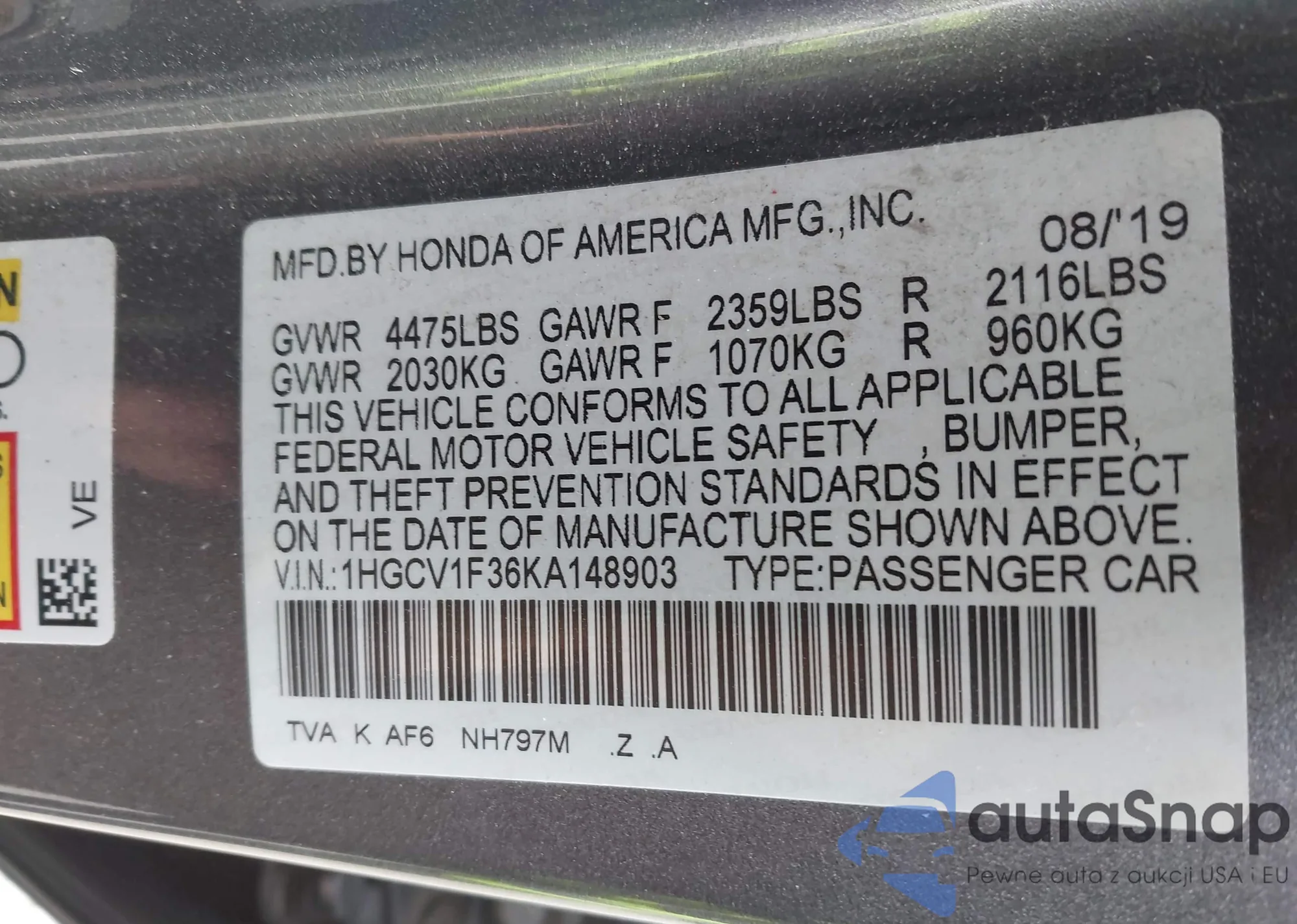 • VIN 1HGCV1F36KA148903