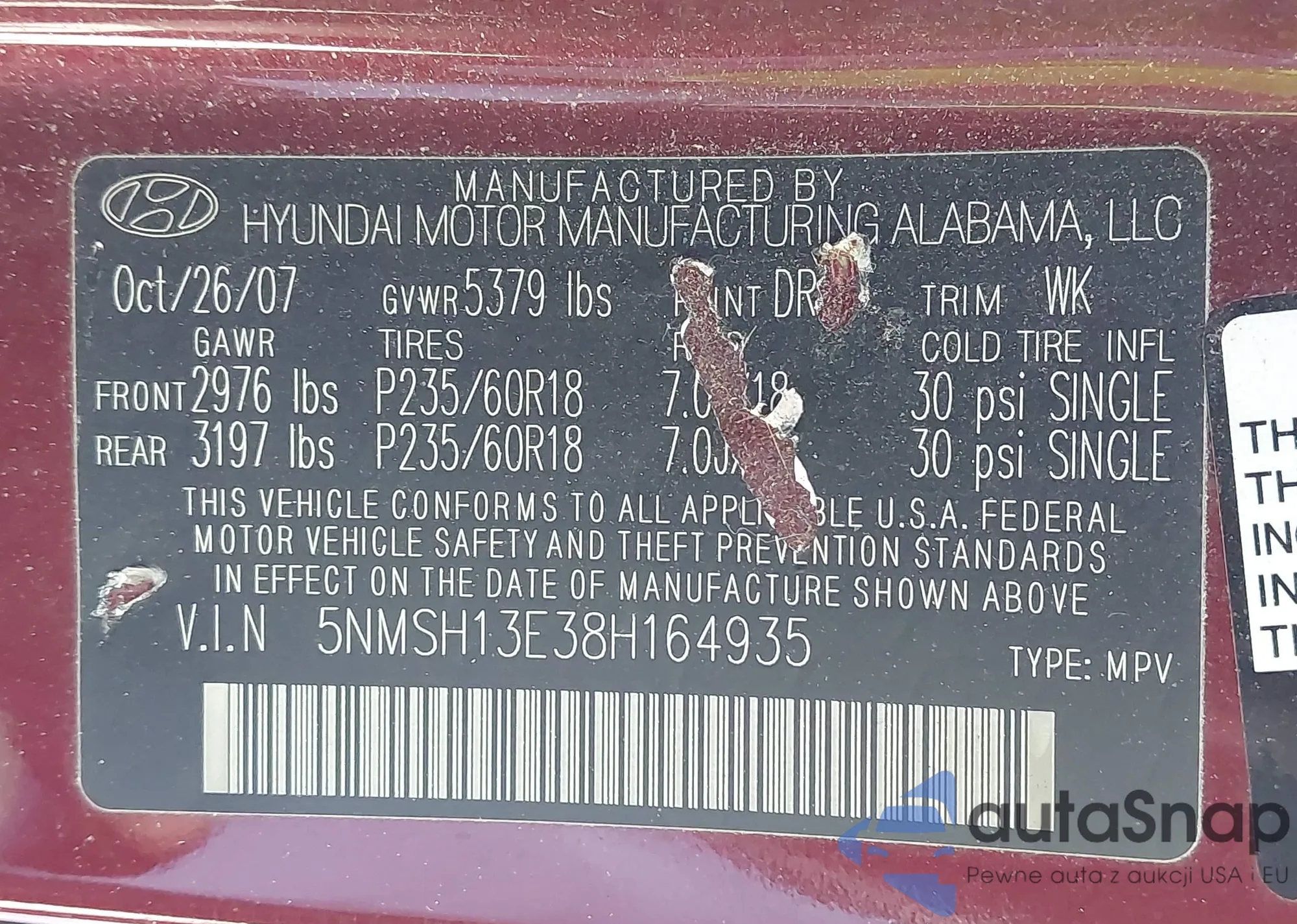 • VIN 5NMSH13E38H164935
