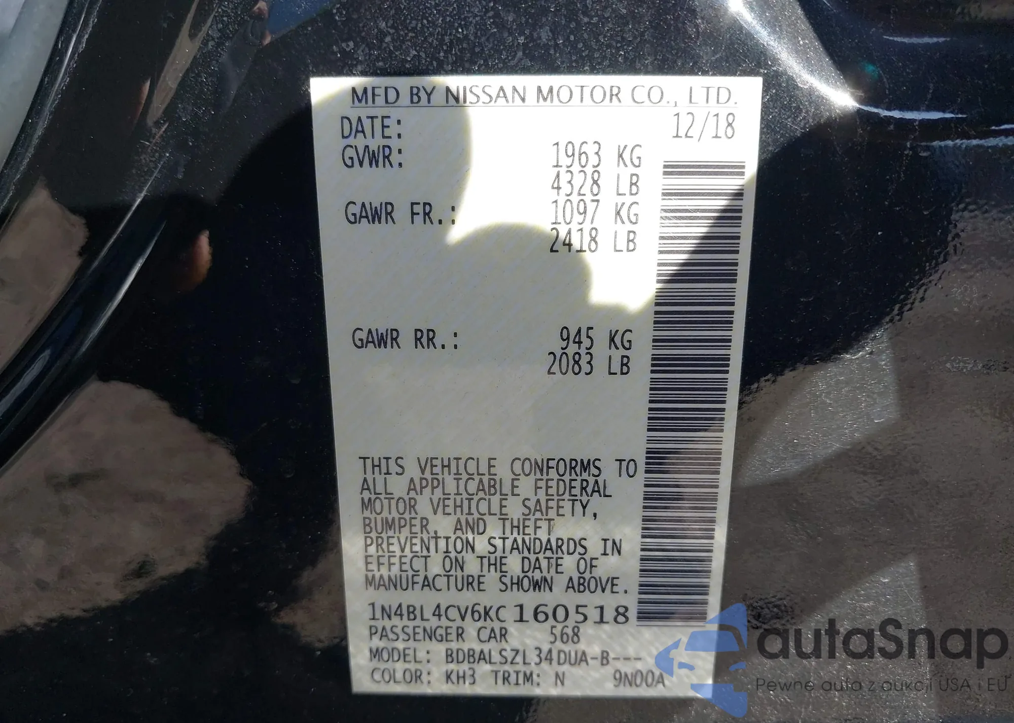 • VIN 1N4BL4CV6KC160518