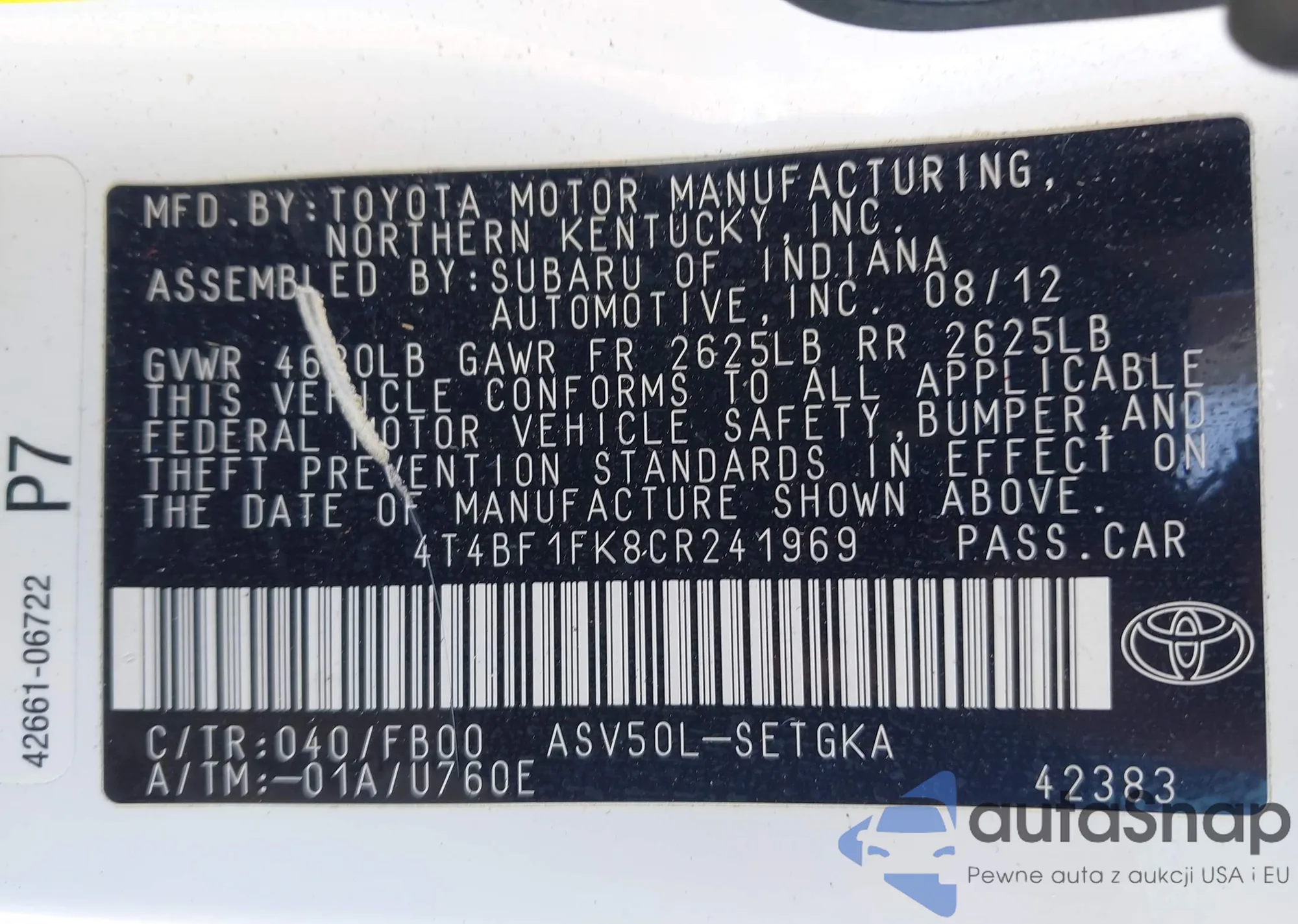 LOT: 42025752 VIN: 4T4BF1FK8CR241969