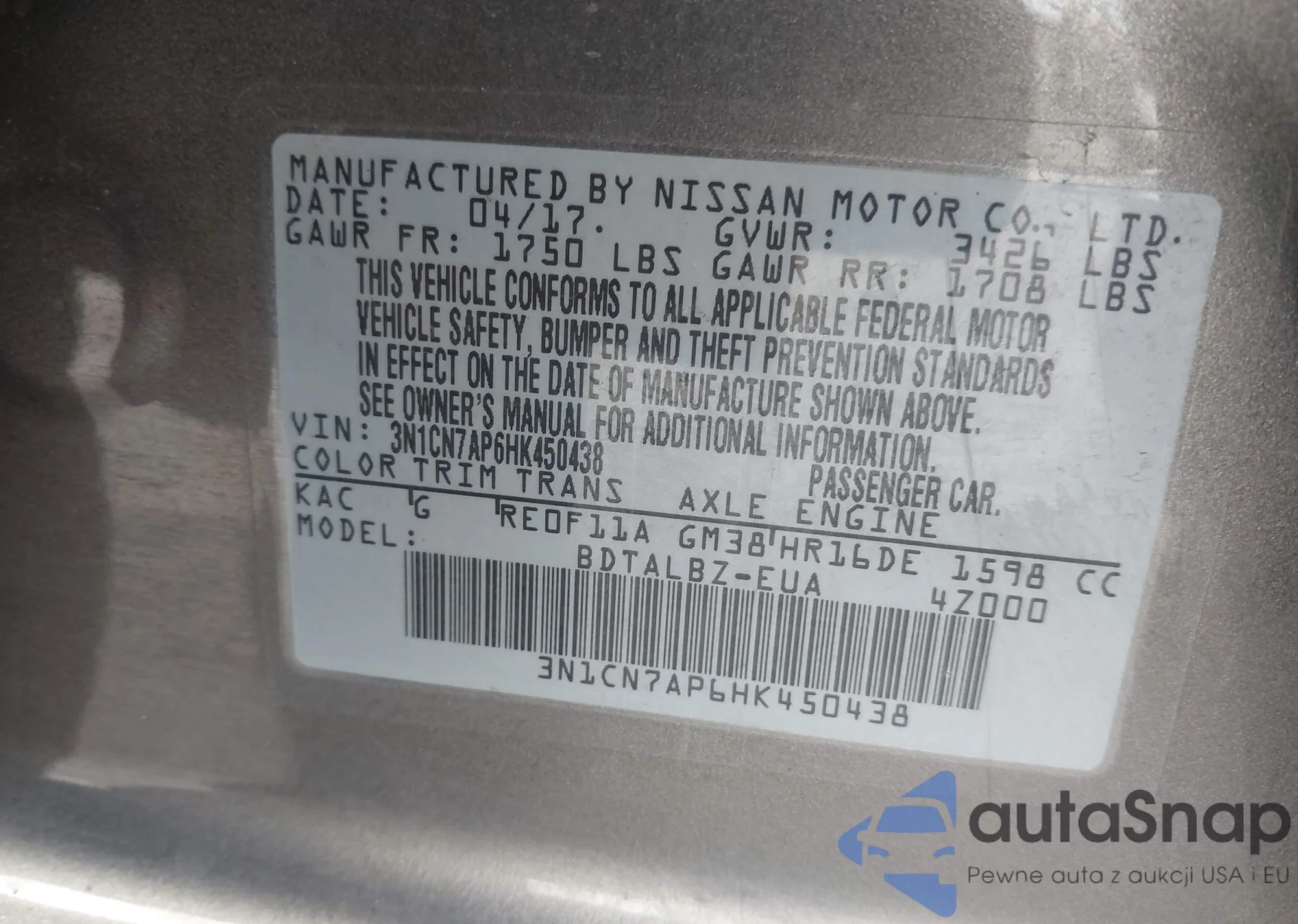 • VIN 3N1CN7AP6HK450438
