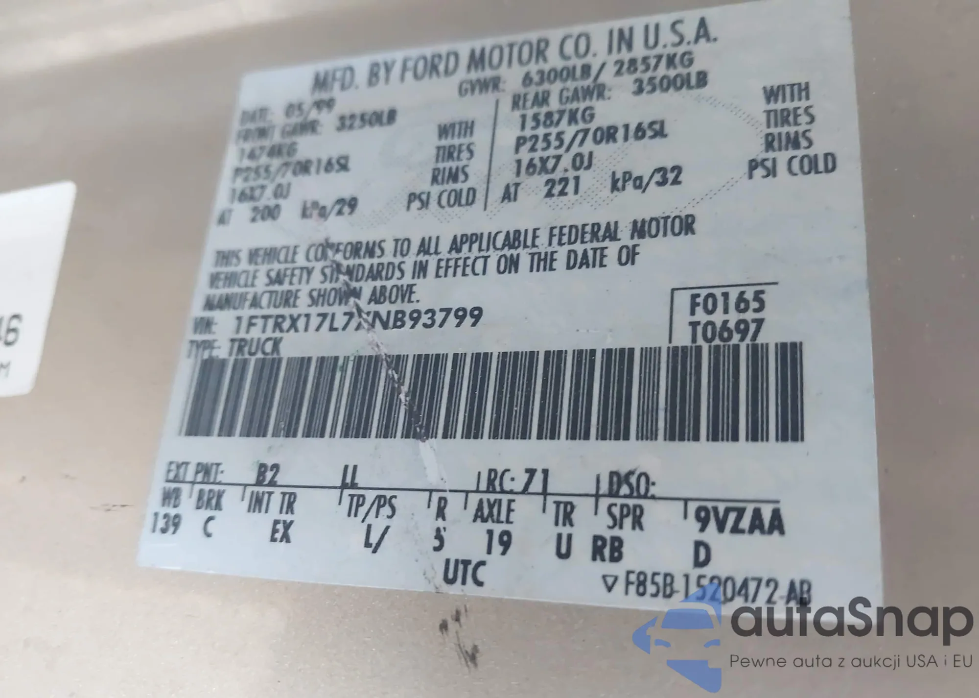 • VIN 1FTRX17L7XNB93799