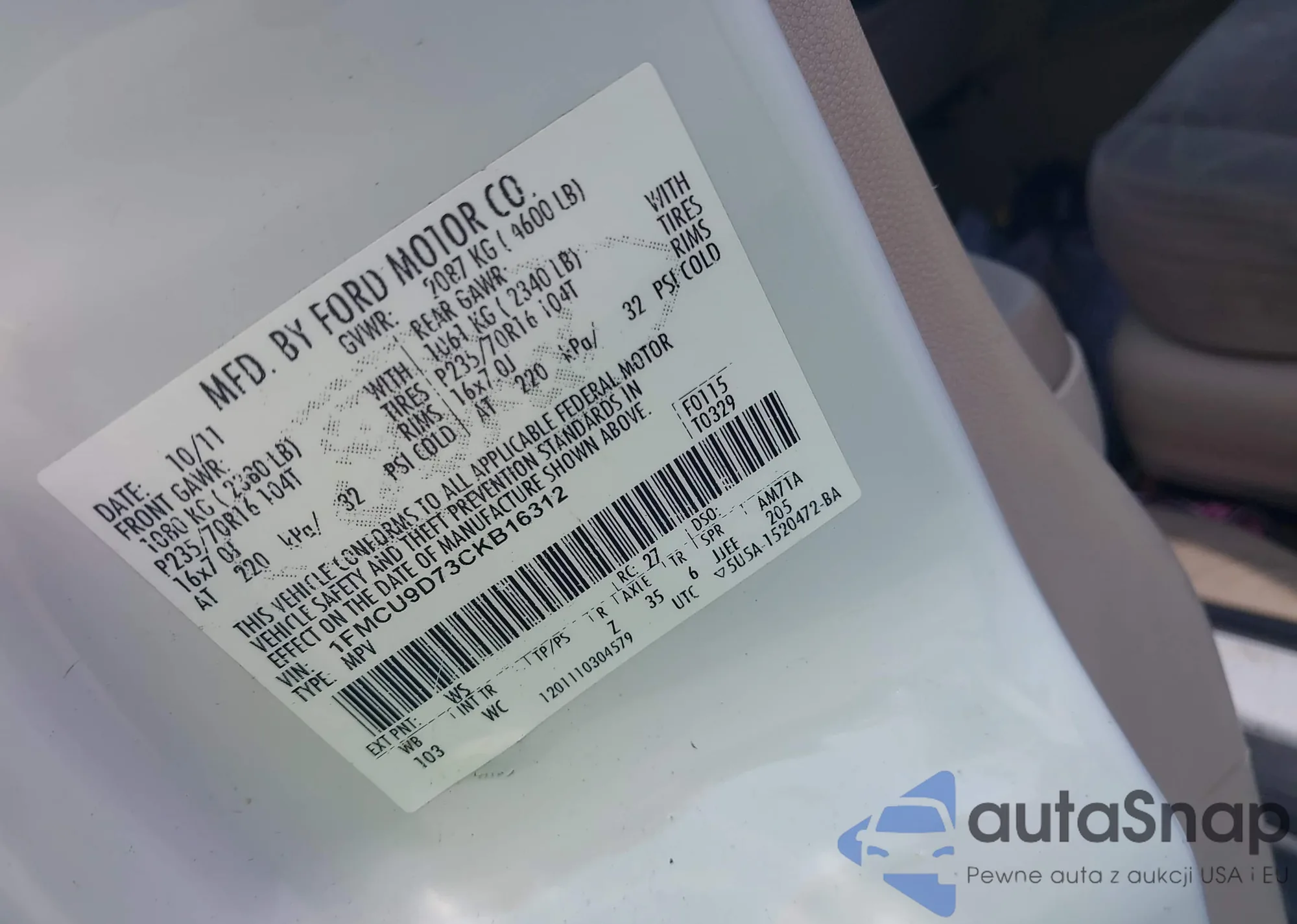 • VIN 1FMCU9D73CKB16312