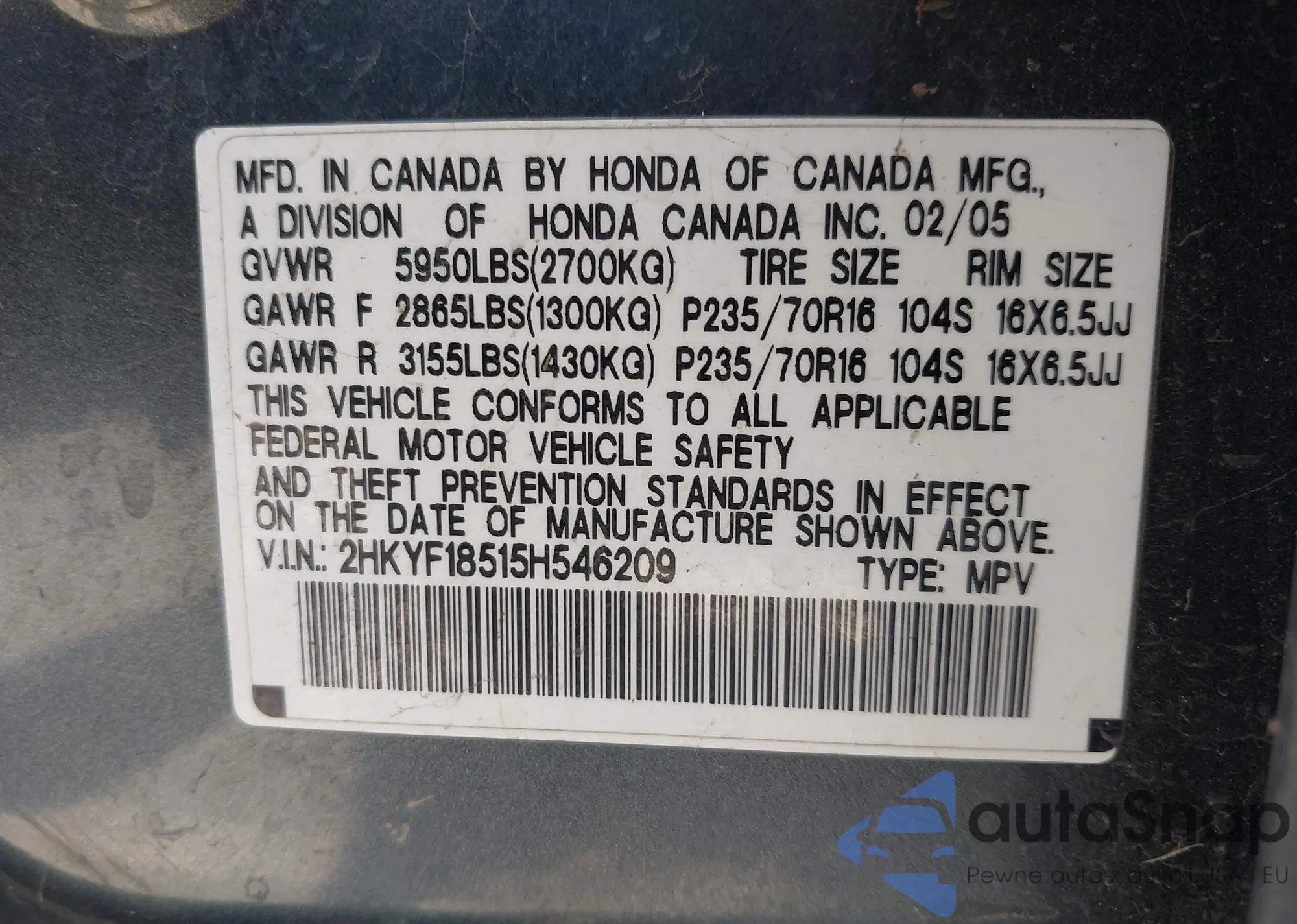 • VIN 2HKYF18515H546209