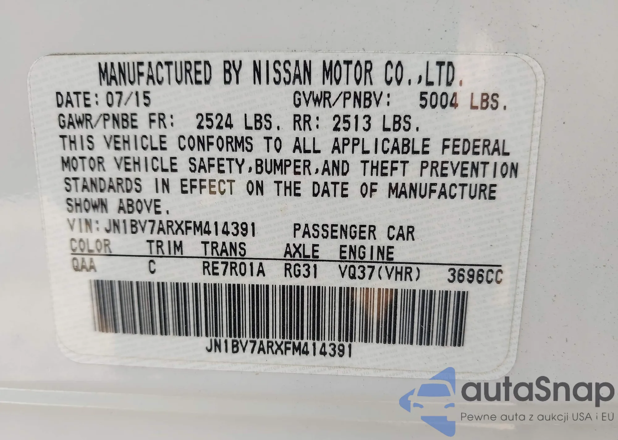 LOT: 42224918 VIN: 5N1AT3BB1MC770638