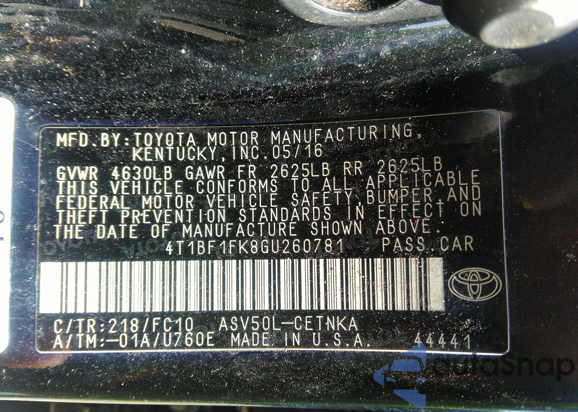 • VIN 4T1BF1FK8GU260781