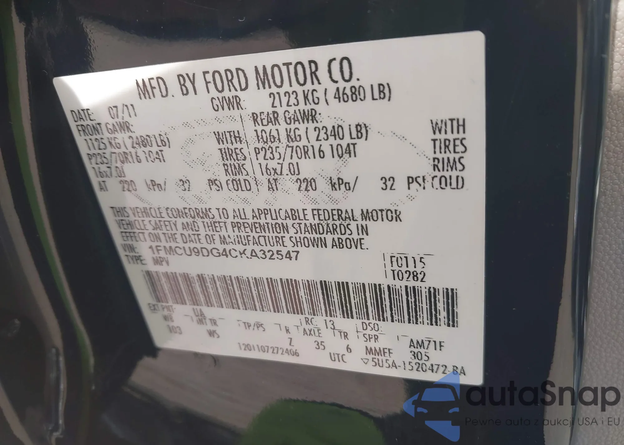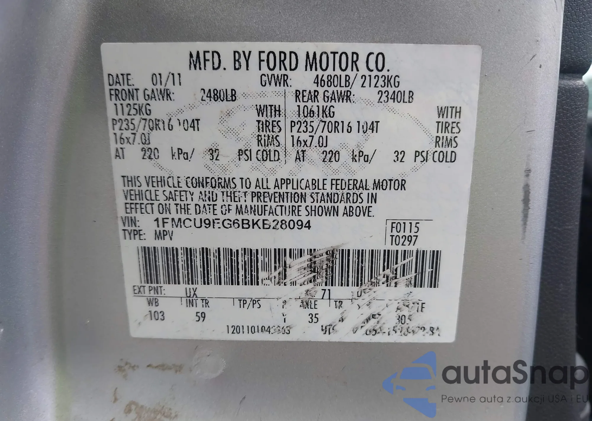LOT: 42164158 VIN: 1FMCU9EG6BKB28094