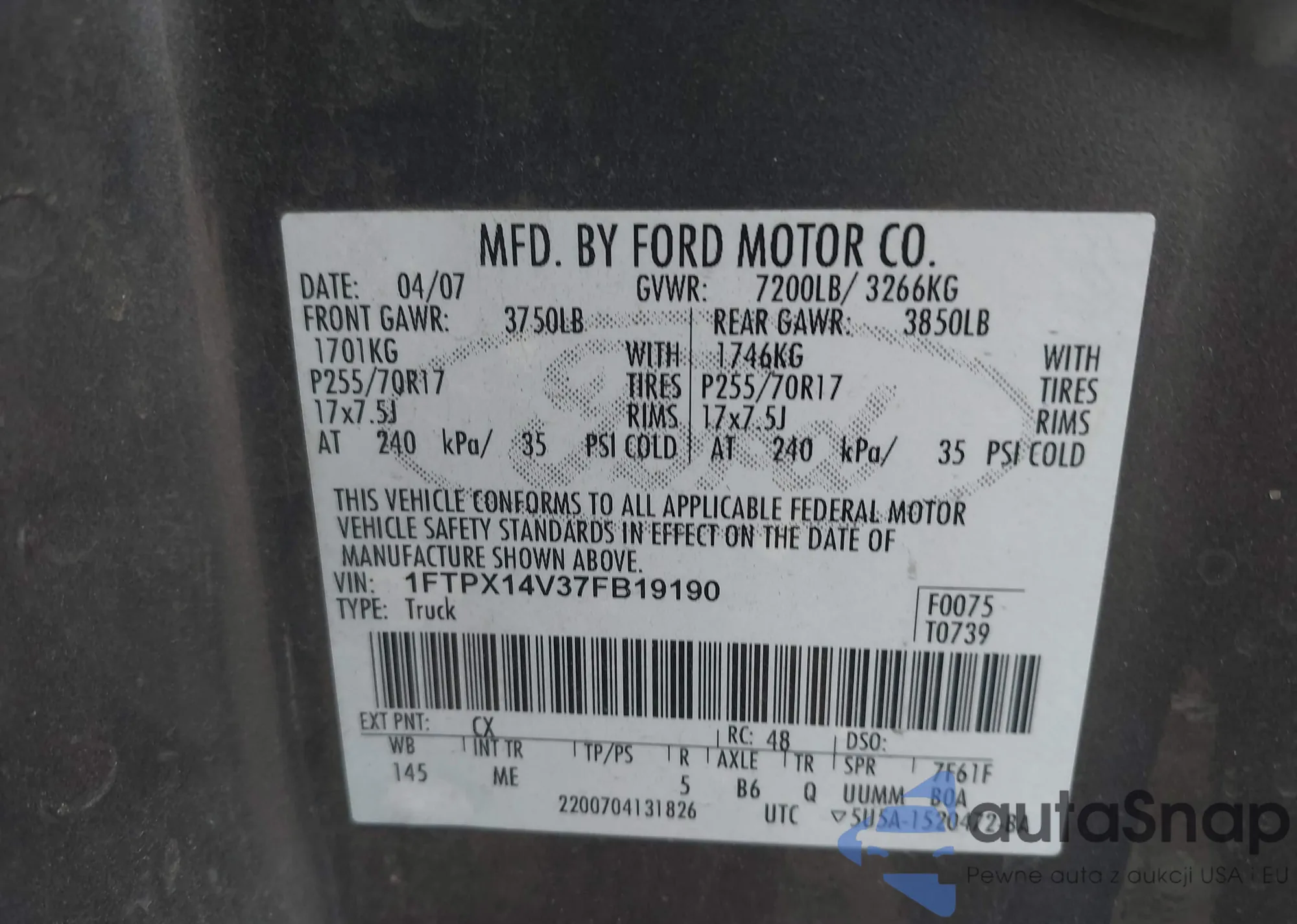 LOT: 42056554 VIN: 1FTPX14V37FB19190
