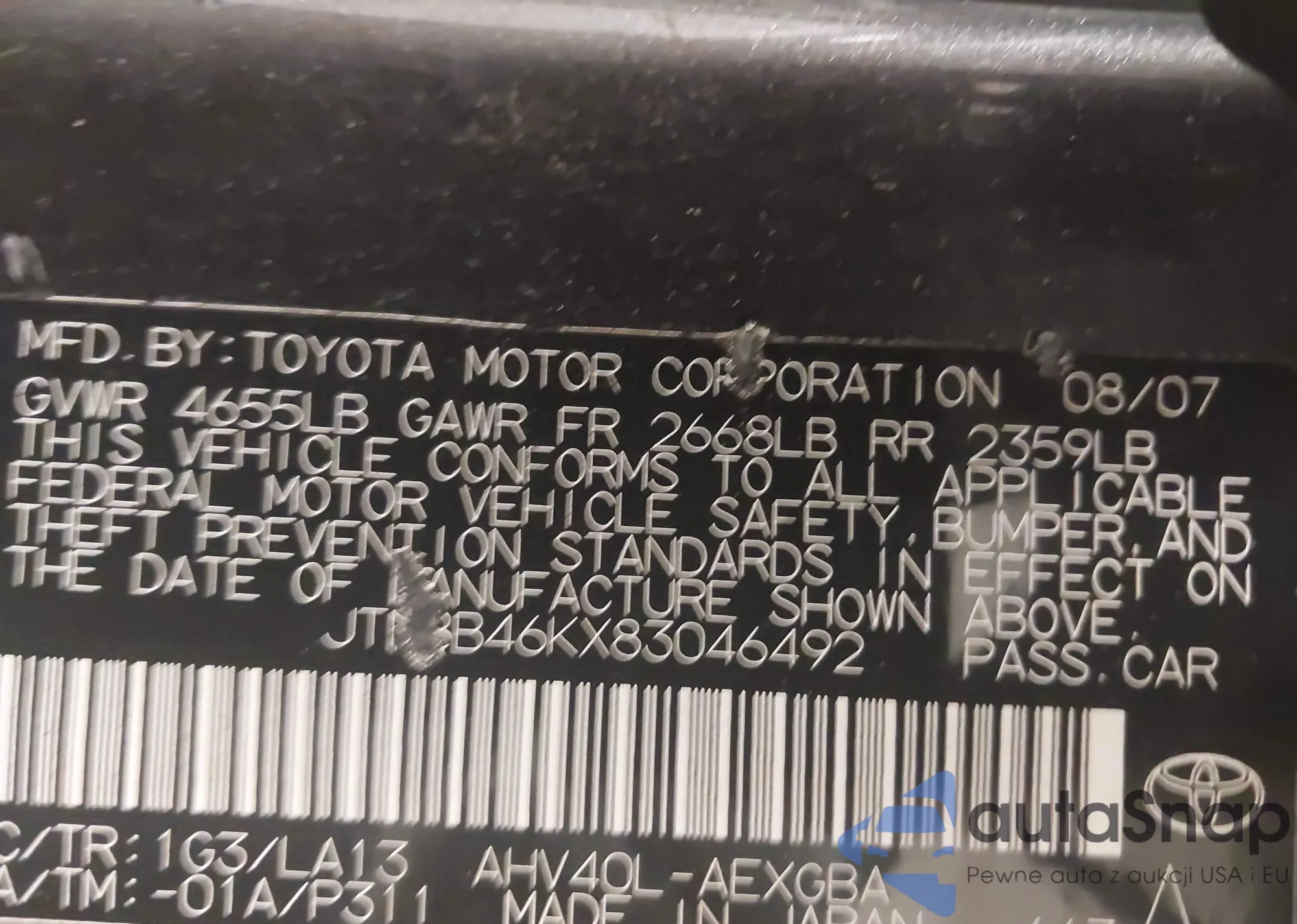 LOT: 42284033 VIN: JTNBE46K373075645