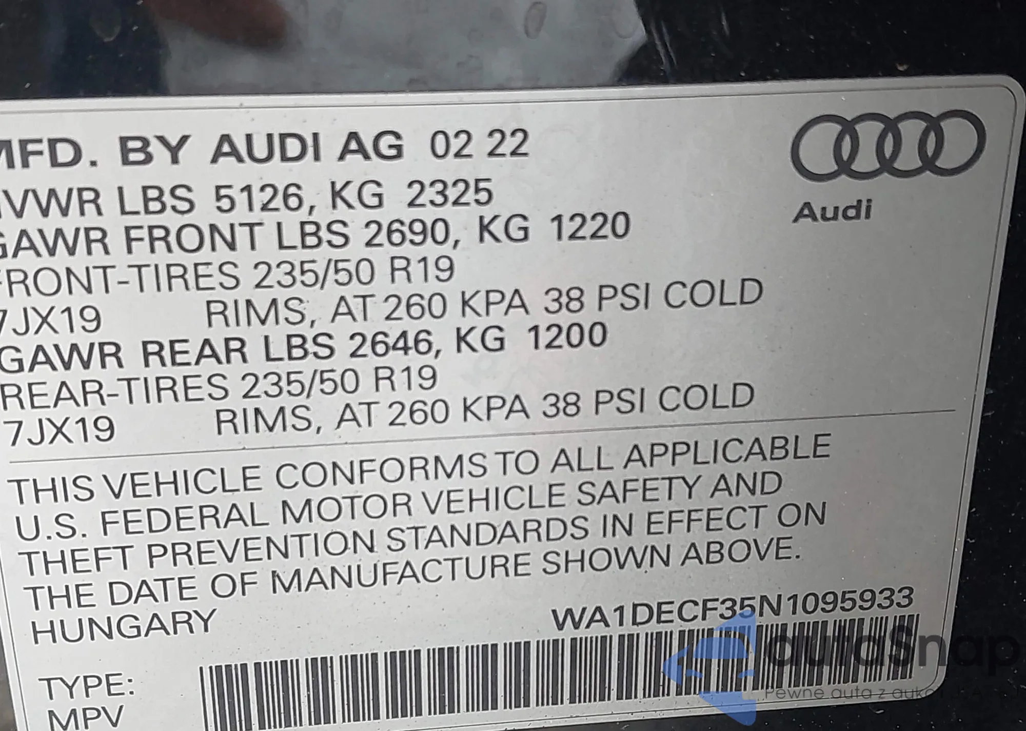 LOT: 42250687 VIN: WA1DECF35N1095933