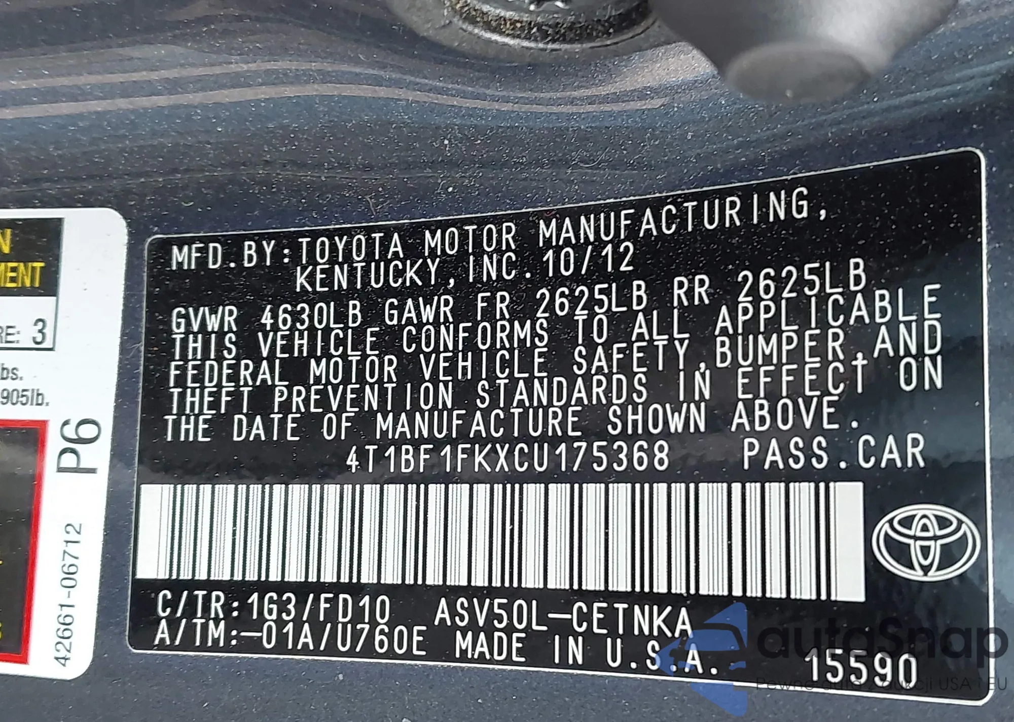 • VIN 4T1BF1FKXCU175368