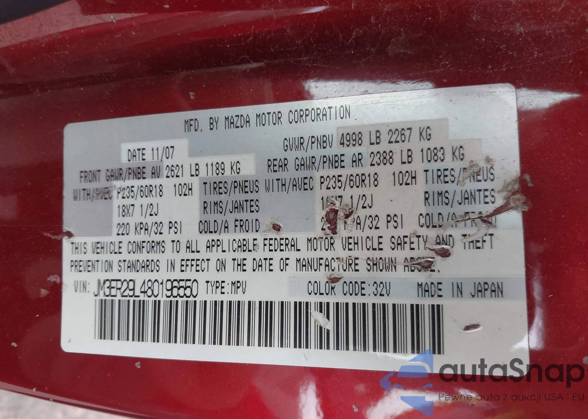 LOT: 42288937 VIN: JM3ER29L480196550
