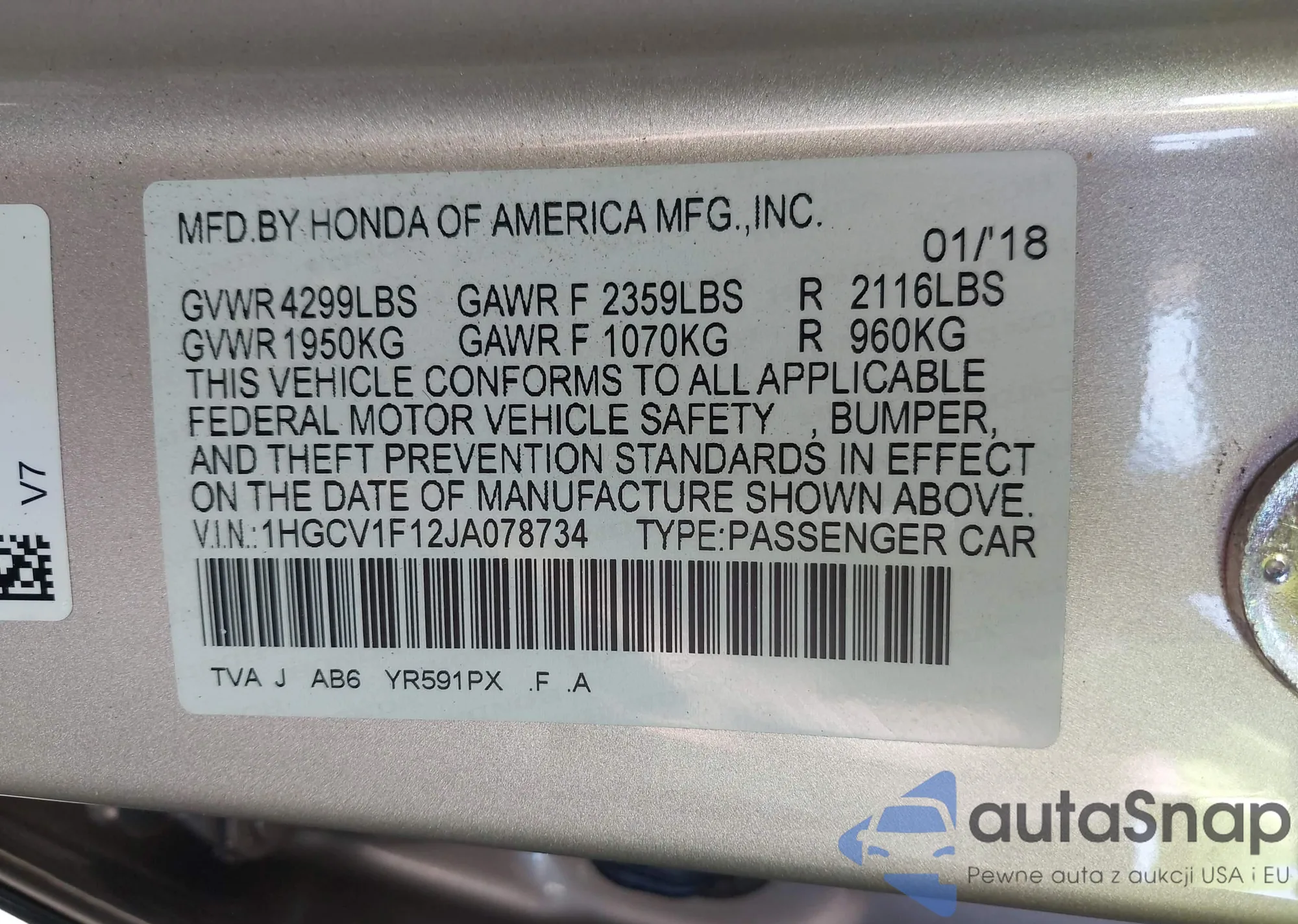 LOT: 42294141 VIN: 2HGFG1B61AH538248