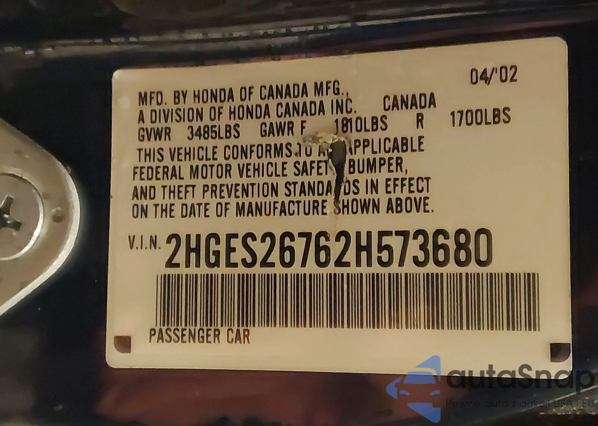 LOT: 42338112 VIN: 2HGES26762H573680
