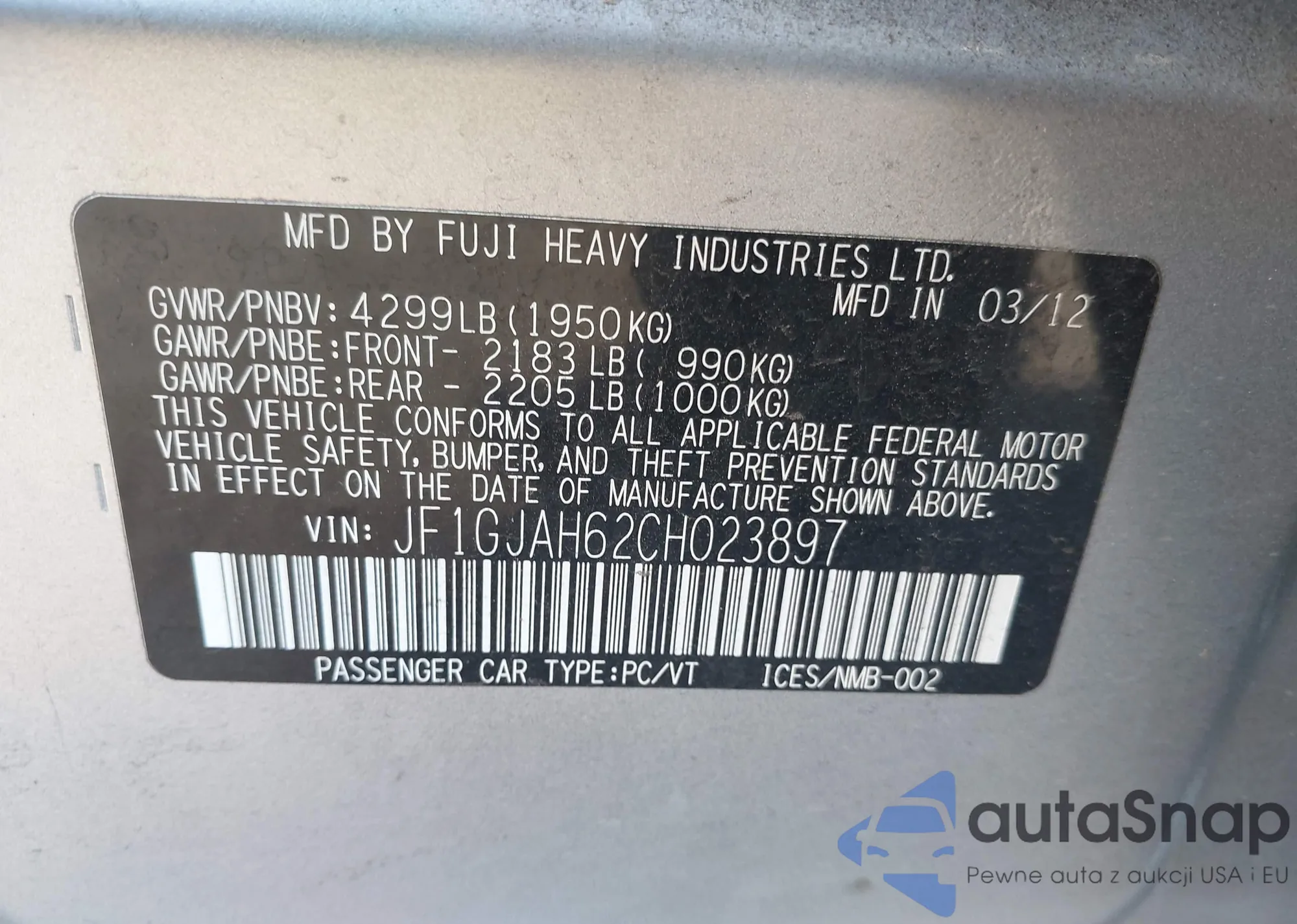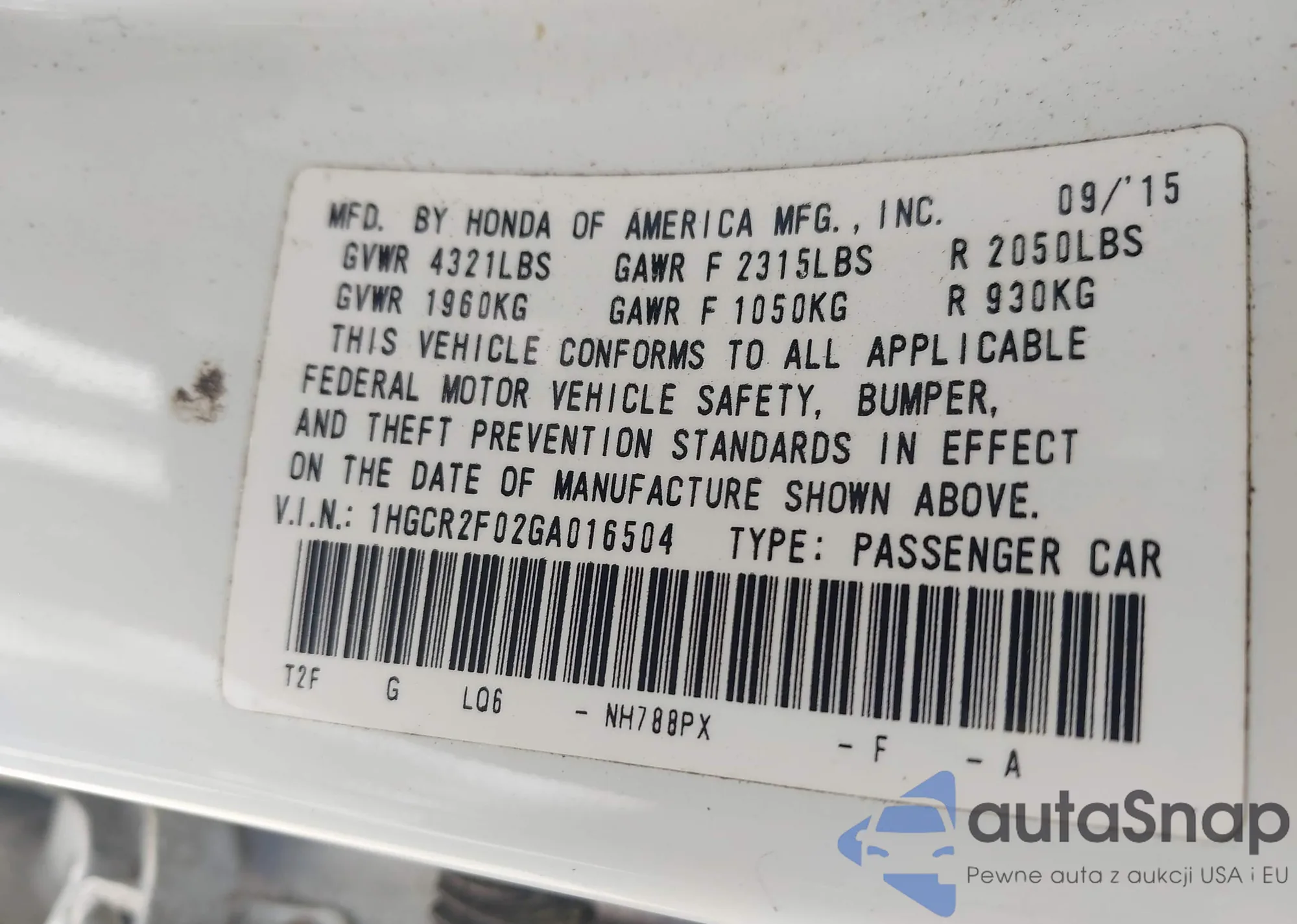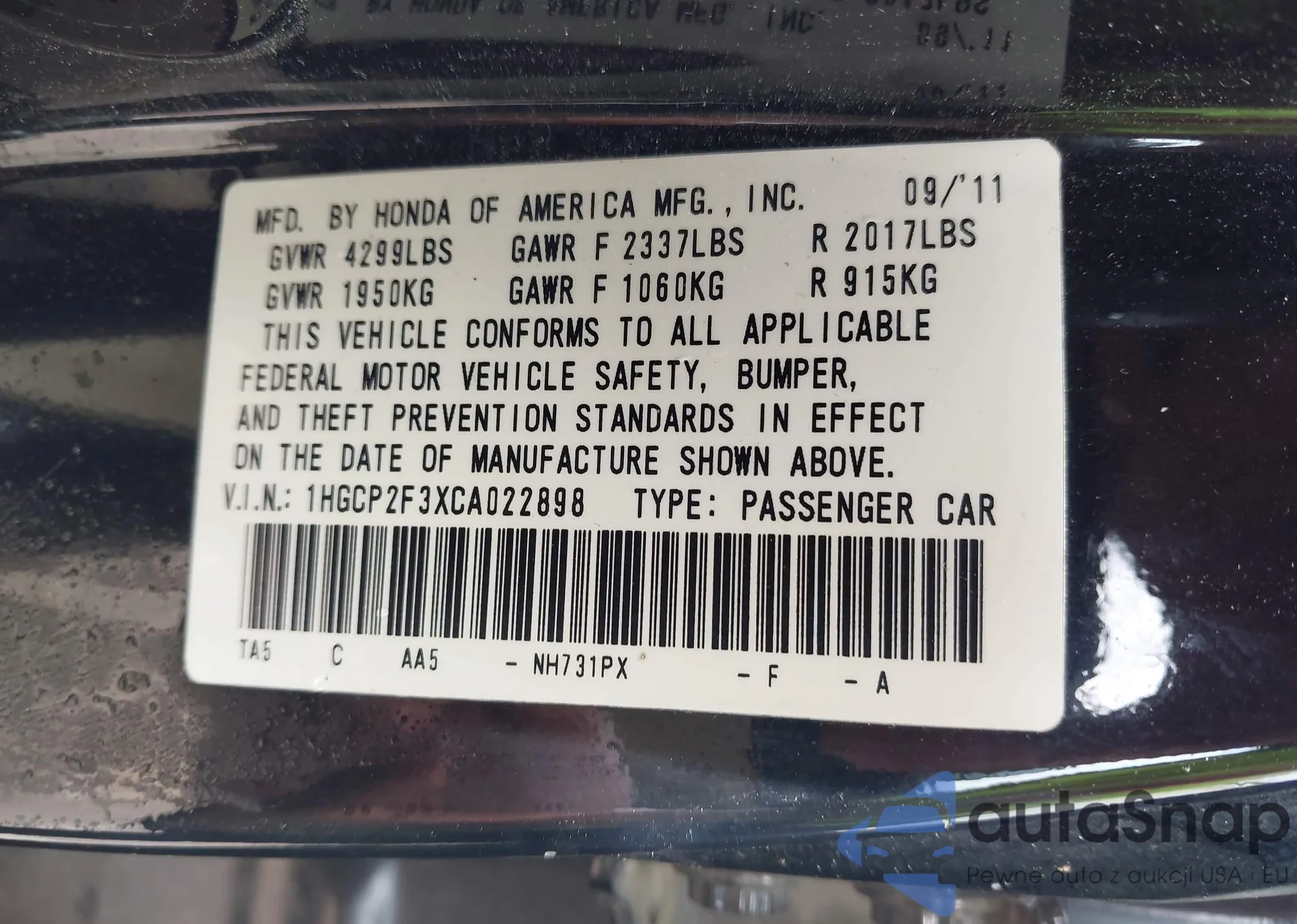 LOT: 42163732 VIN: 1HGCP2F3XCA022898