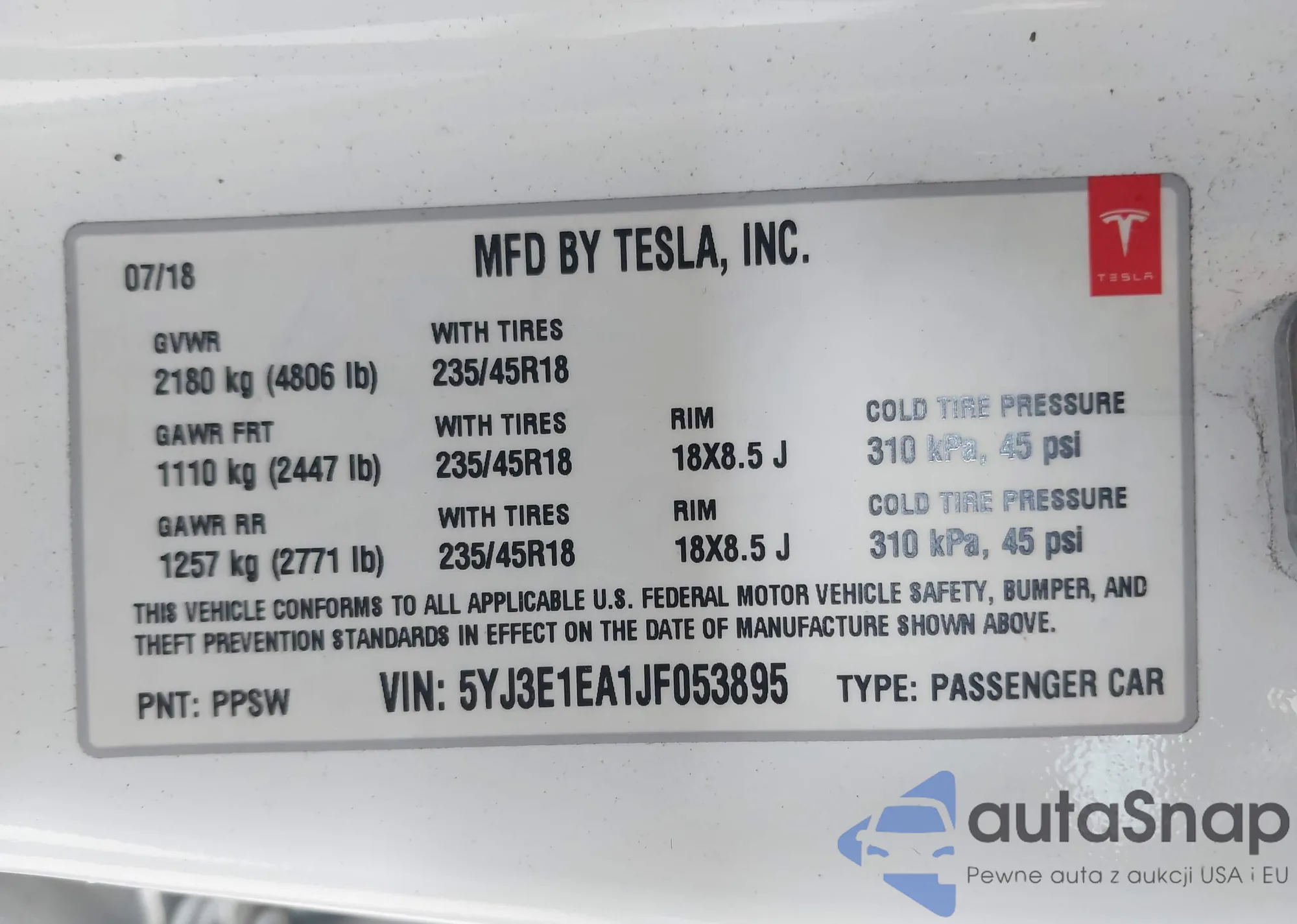 • VIN 5YJ3E1EA1JF053895