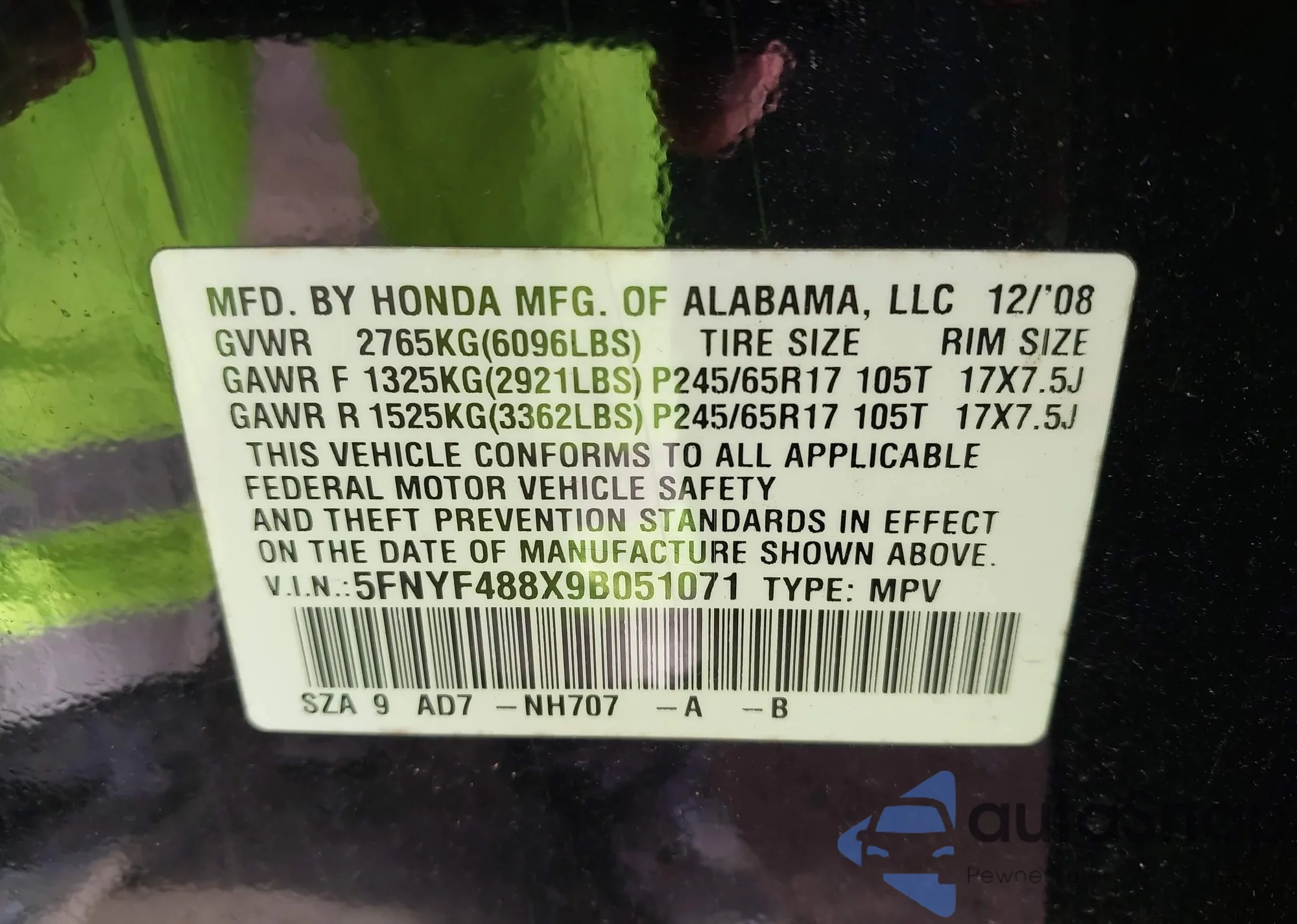 • VIN 5FNYF488X9B051071
