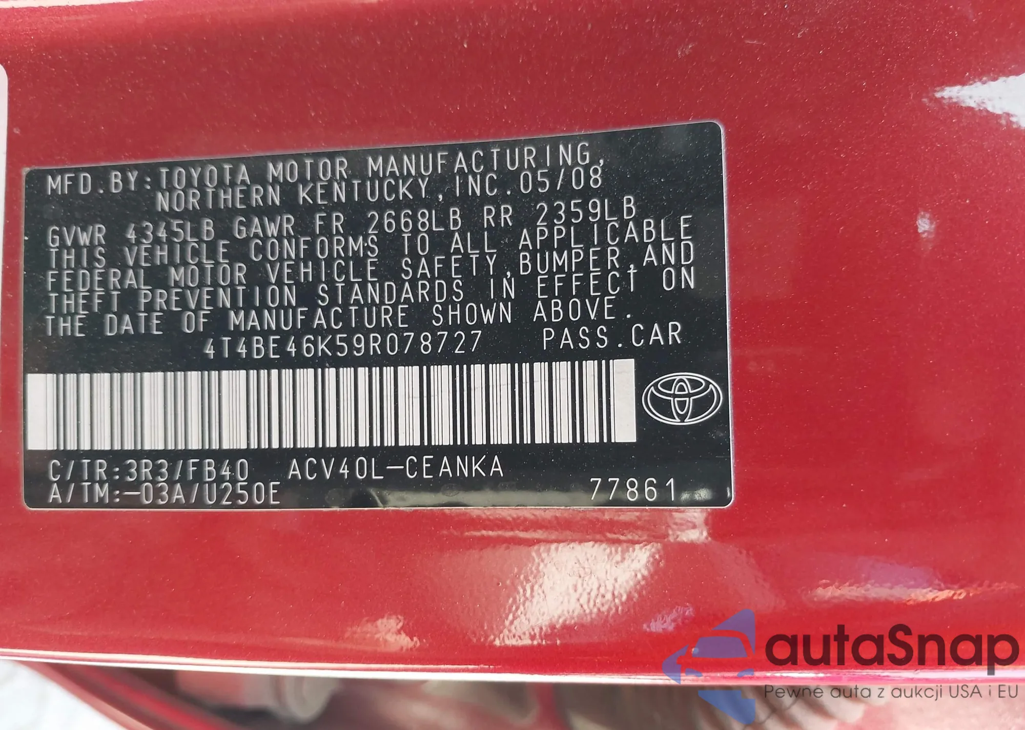 • VIN 4T4BE46K59R078727