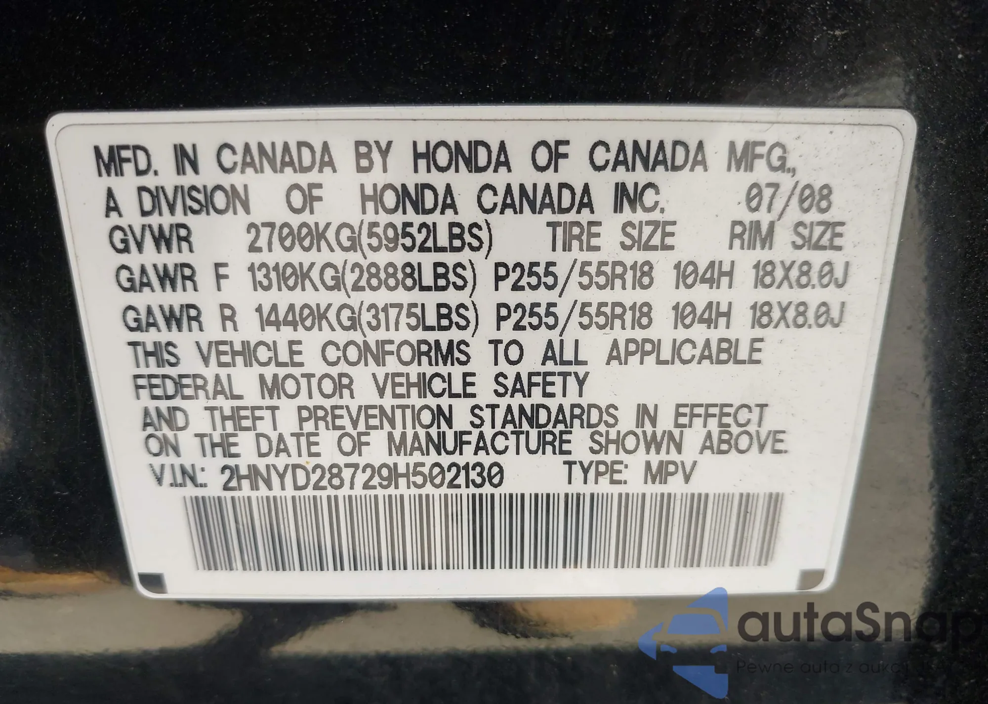 LOT: 42149018 VIN: 2HNYD28729H502130