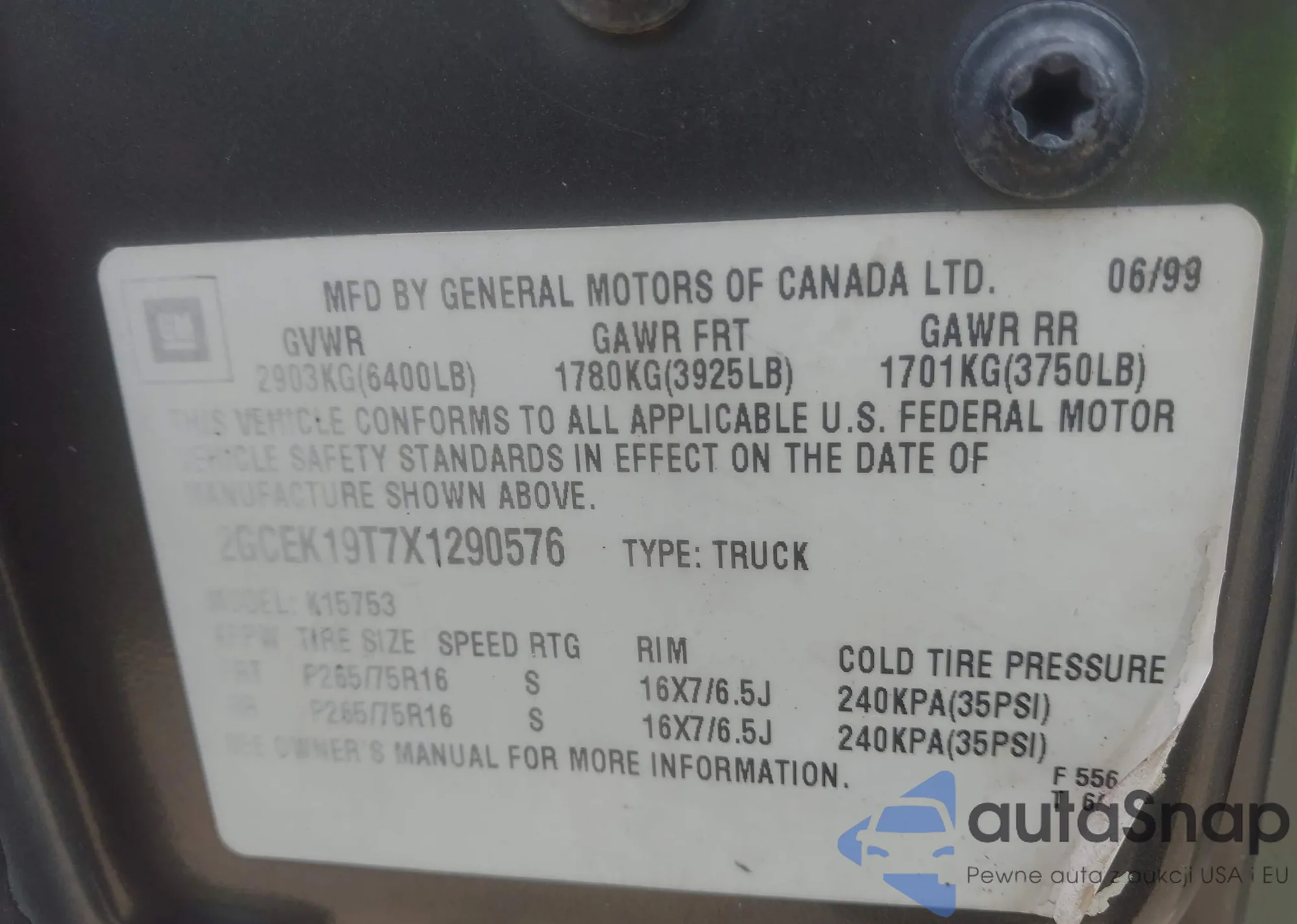 • VIN 2GCEK19T7X1290576