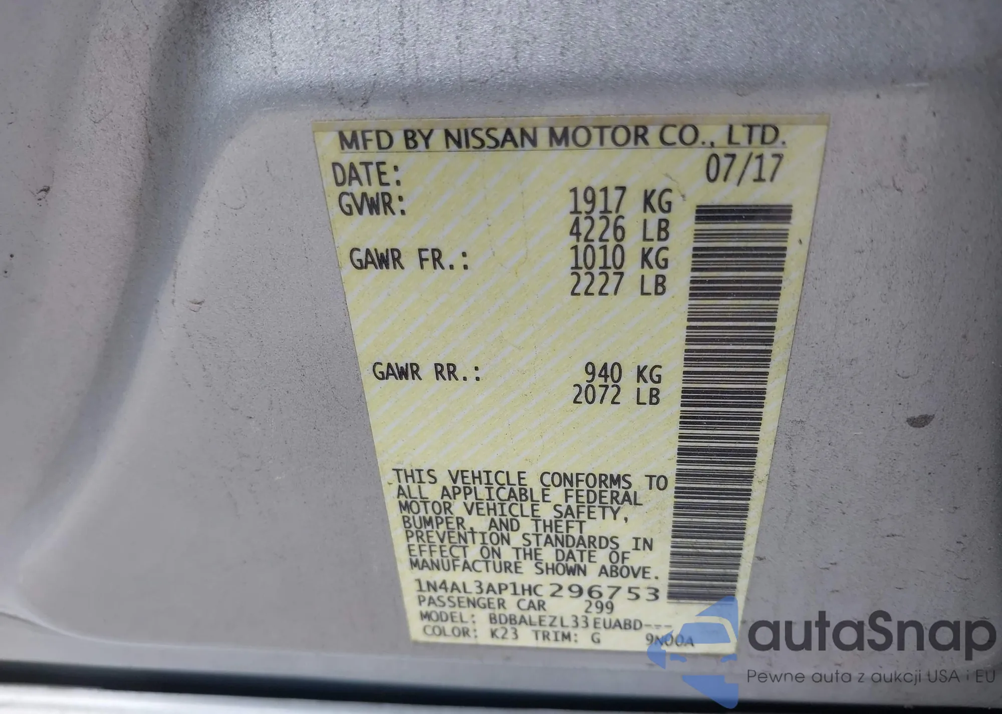 LOT: 42213658 VIN: 1N4AL3AP1HC296753