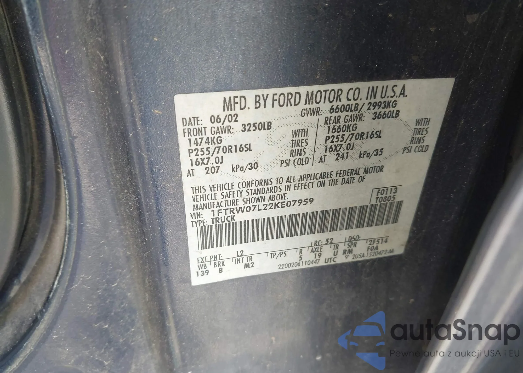 LOT: 42226289 VIN: 1FTRW07L22KE07959