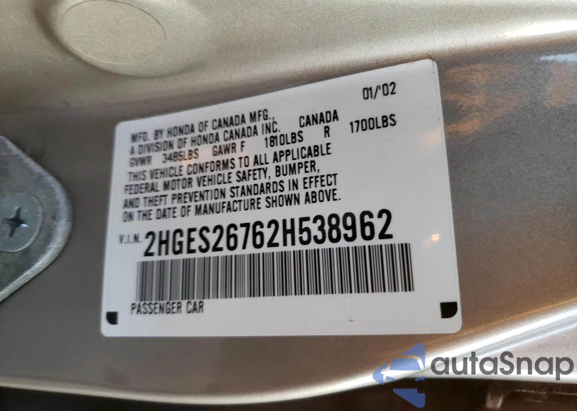 LOT: 55504325 VIN: 2HGES26762H538962