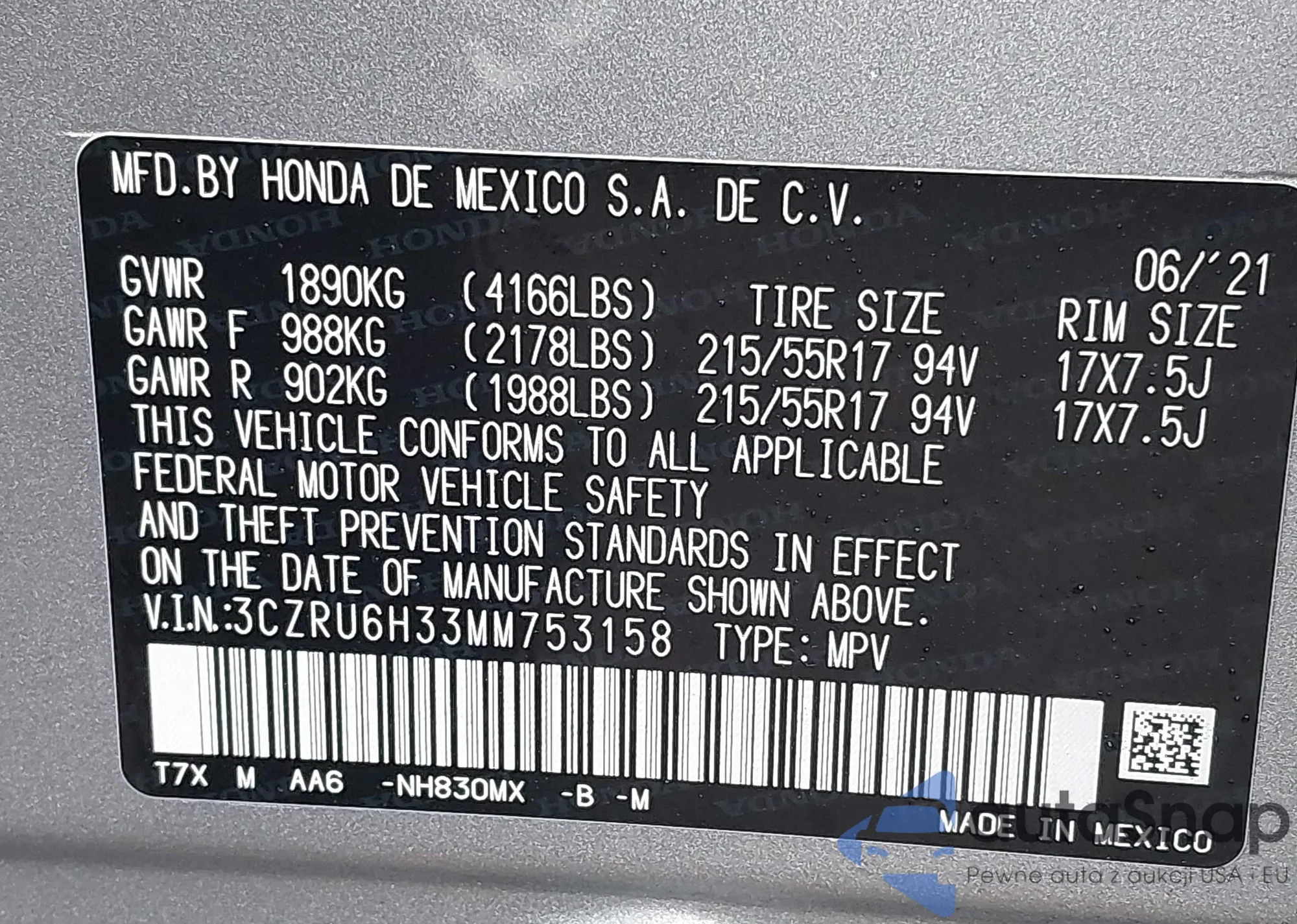 • VIN 3CZRU6H33MM753158