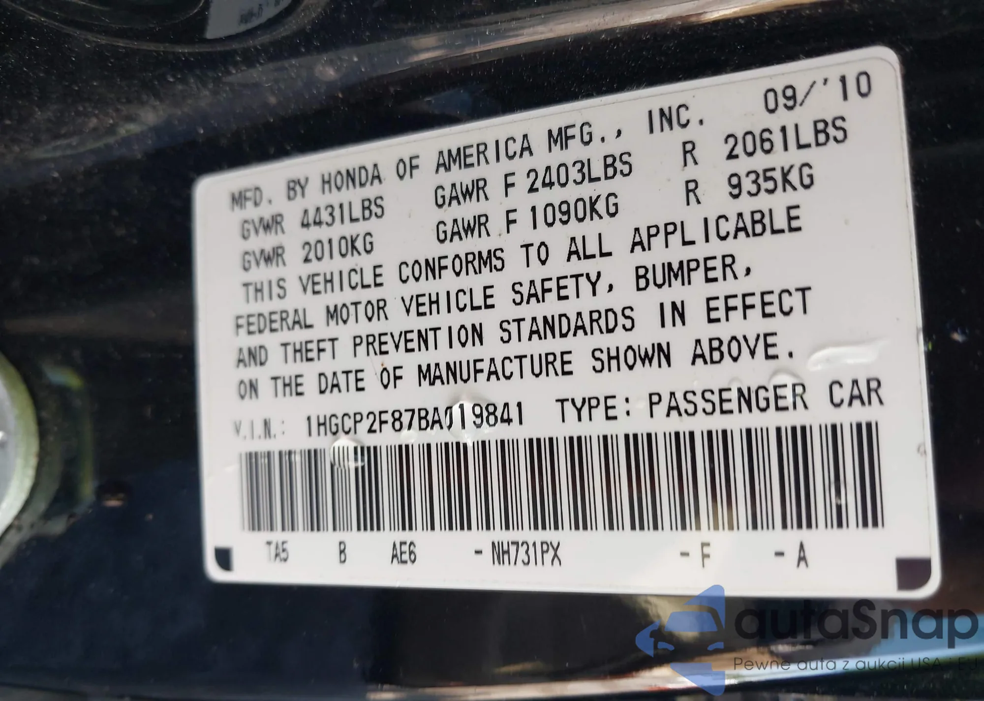 LOT: 42196669 VIN: 1HGCP2F87BA019841