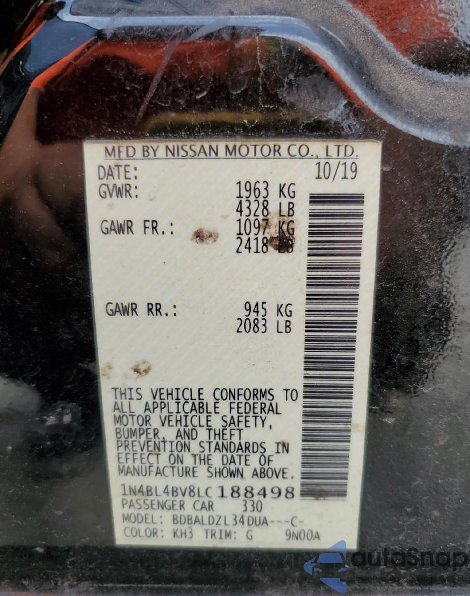 • VIN 1N4BL4BV8LC188498