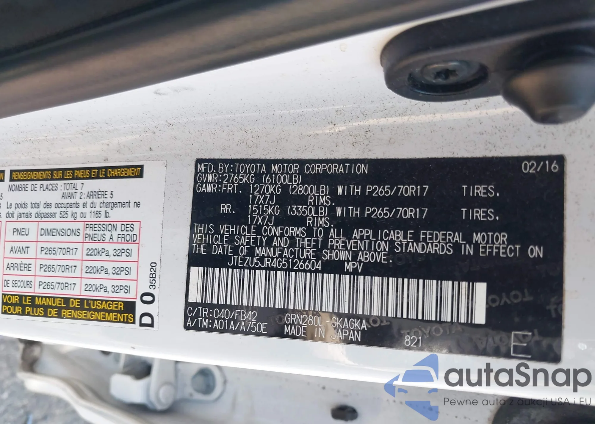 LOT: 42133073 VIN: JTEZU5JR4G5126604