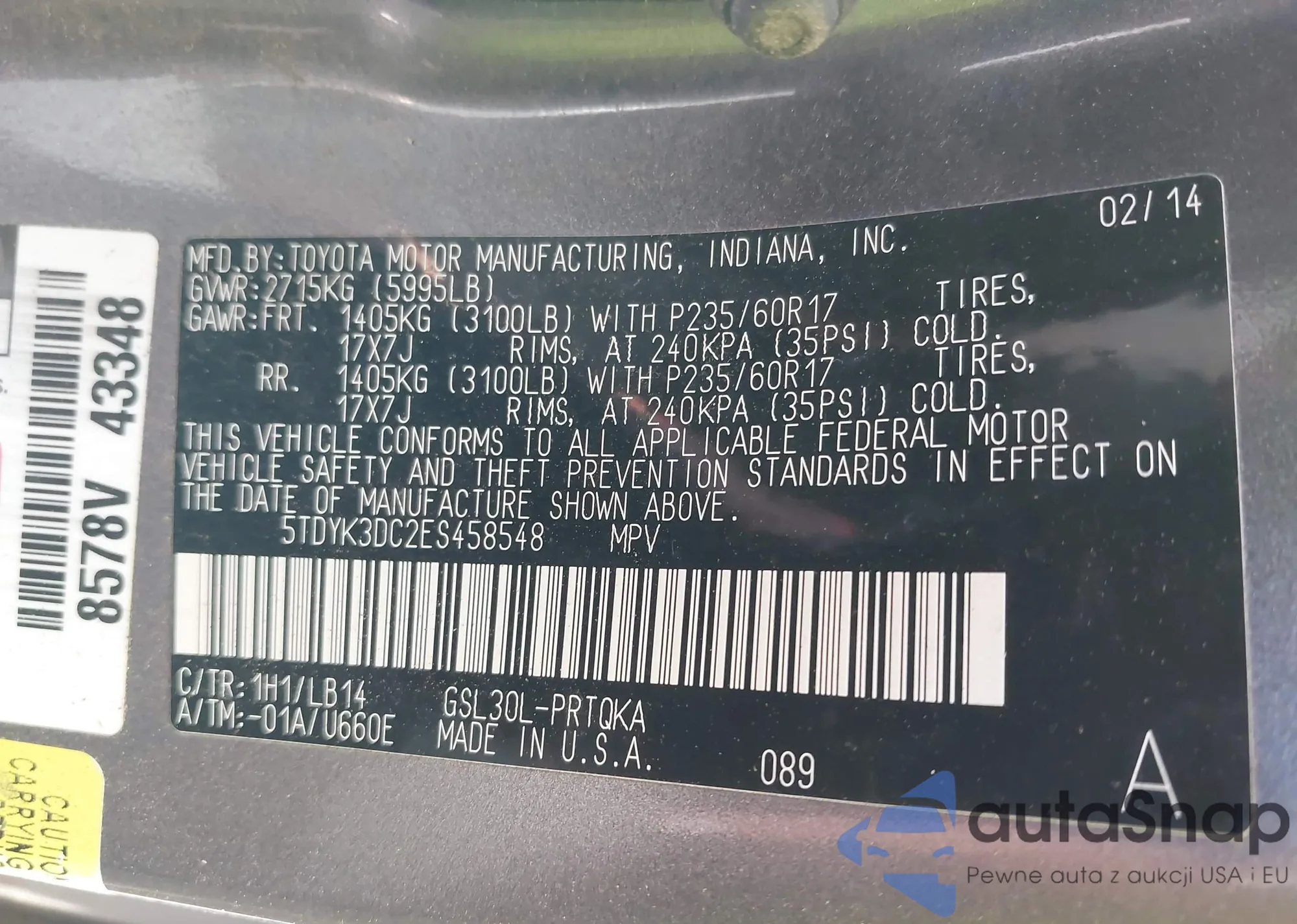 LOT: 39503064 VIN: 5TDYK3DC2ES458548
