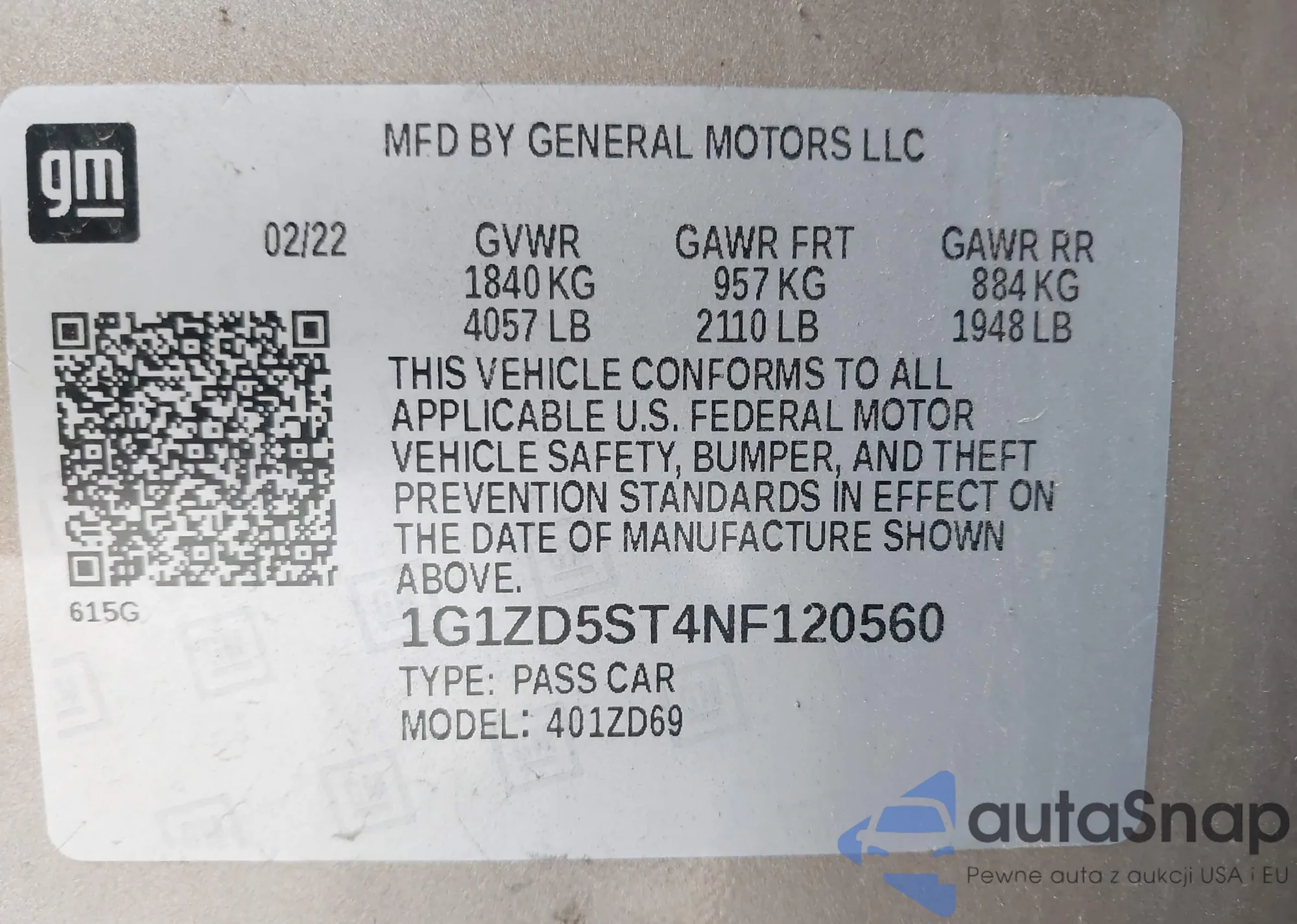LOT: 39985375 VIN: 1G1ZD5ST4NF120560