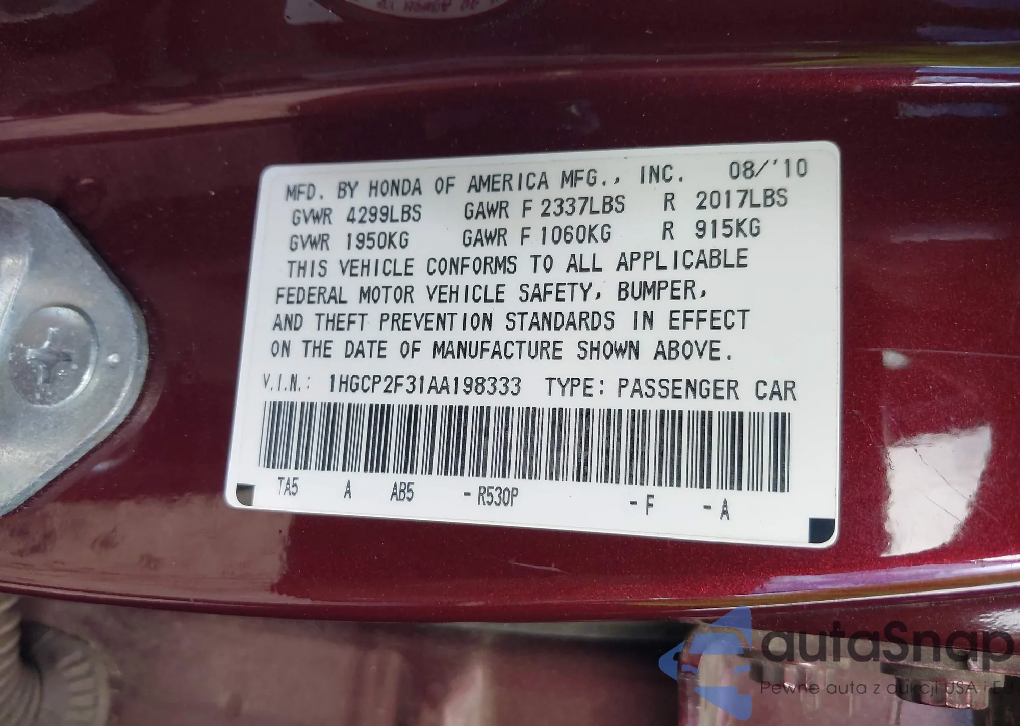 LOT: 42274123 VIN: 1HGCR2F35DA021542