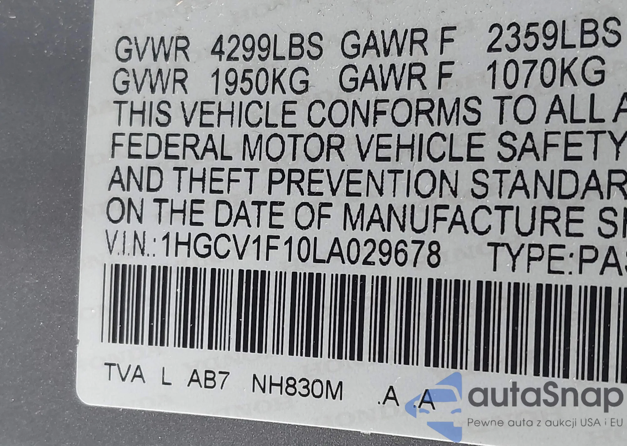 • VIN 1HGCV1F10LA029678