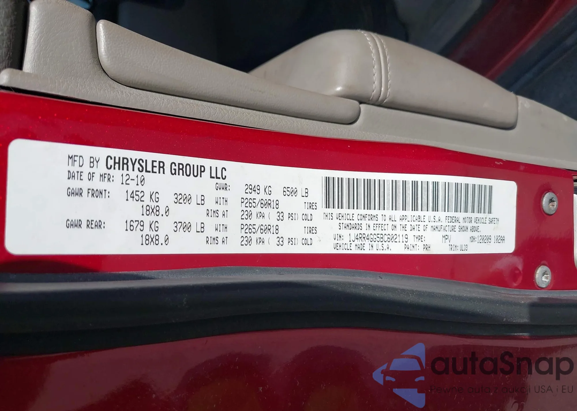 LOT: 40320508 VIN: 1J4RR4GG5BC602119