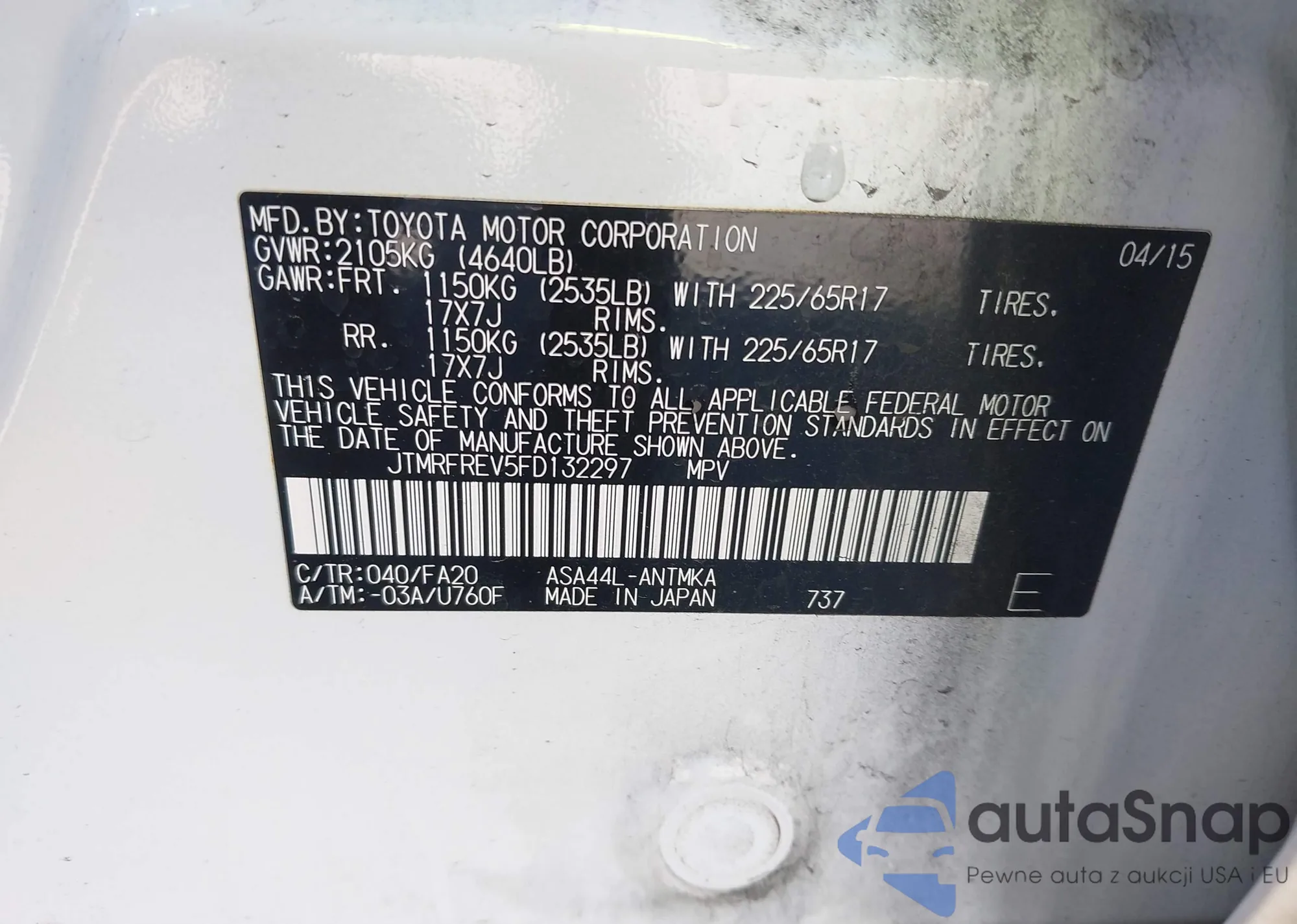 LOT: 42348121 VIN: JTMRFREV5FD132297