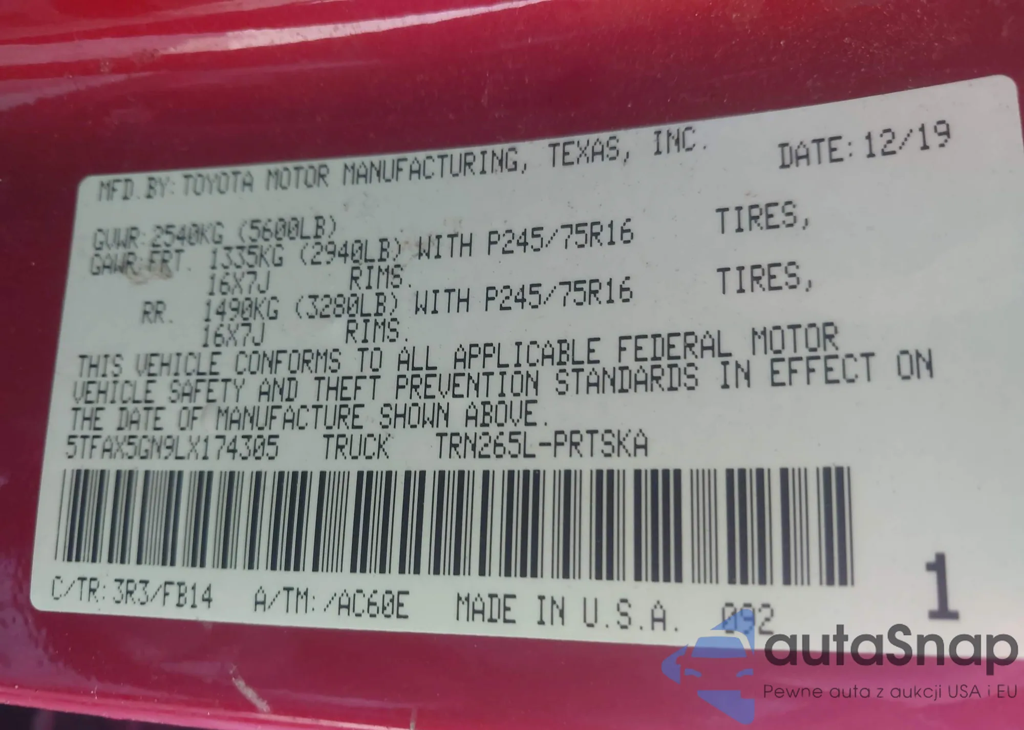 • VIN 5TFAX5GN9LX174305