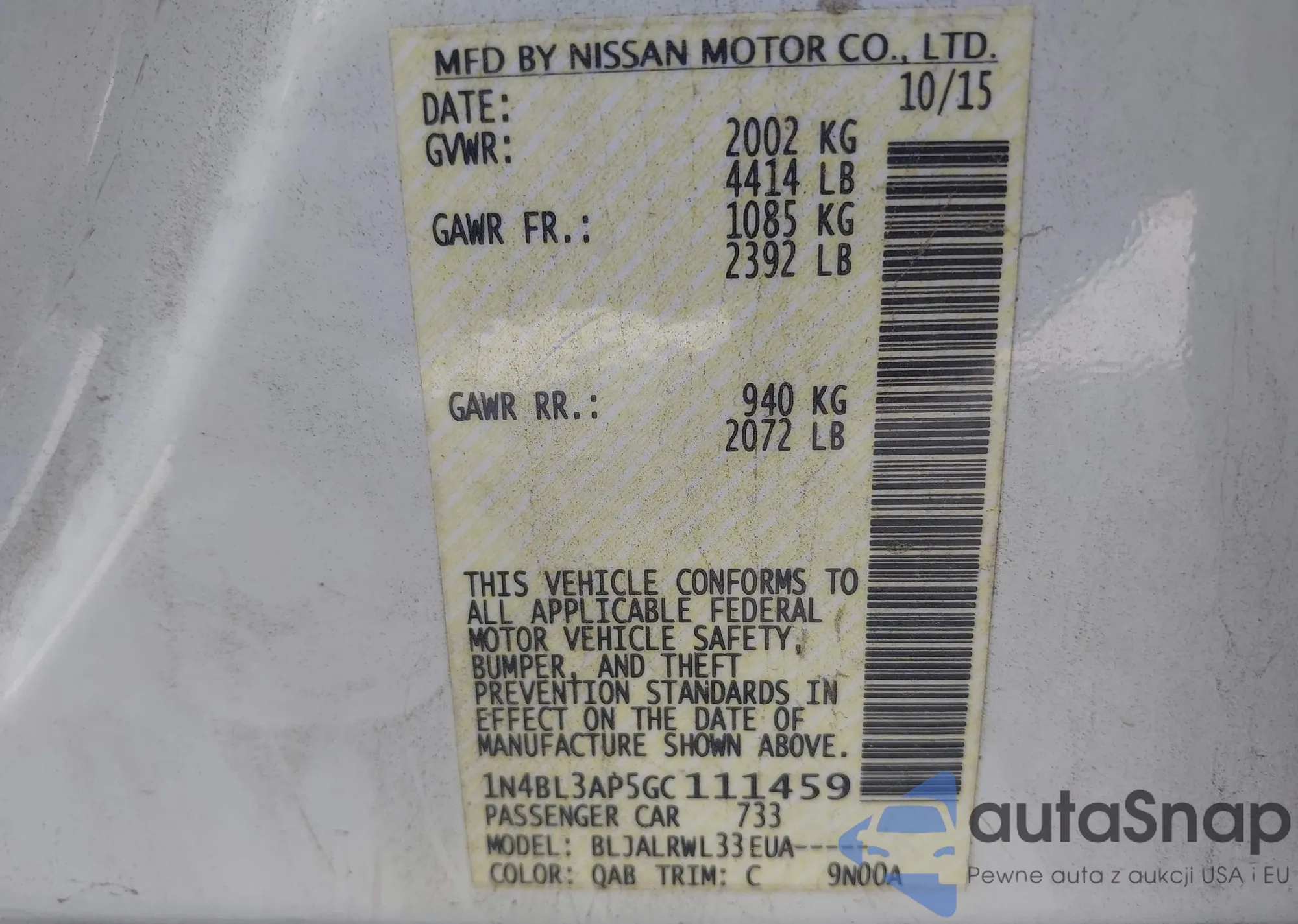 • VIN 1N4BL3AP5GC111459