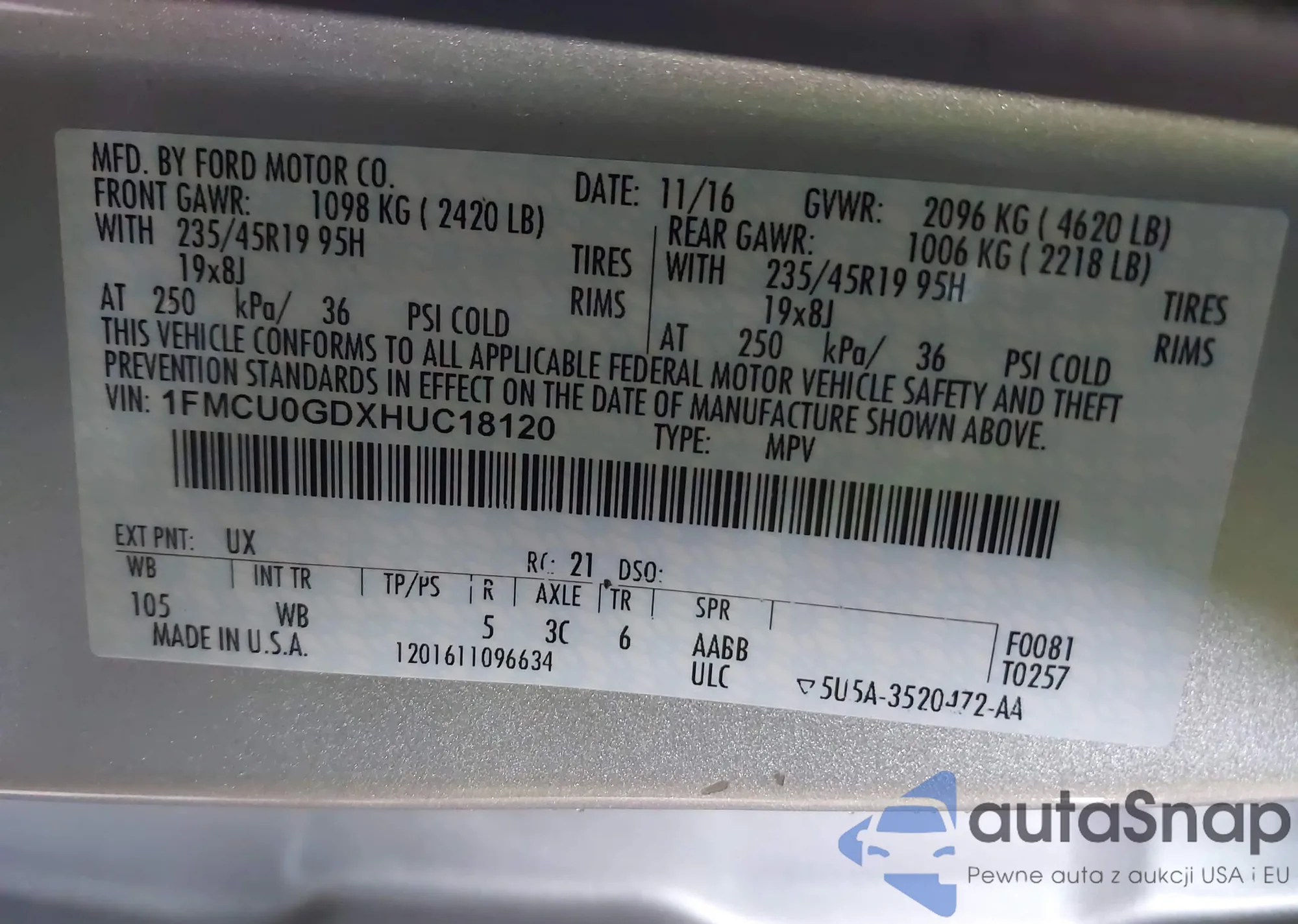LOT: 42356640 VIN: 1FMCU0GDXHUC18120