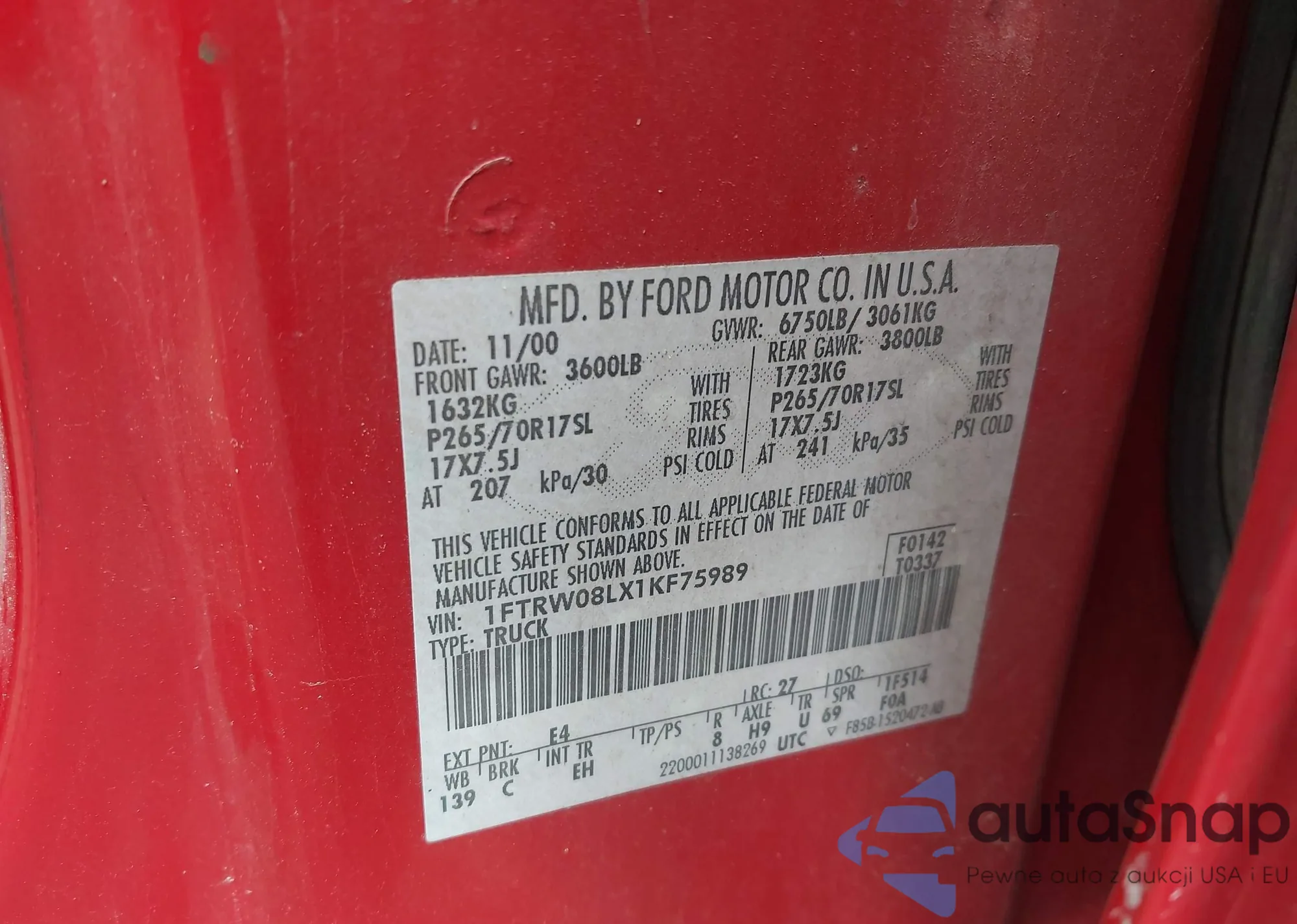 LOT: 42211151 VIN: 1FTRW08LX1KF75989