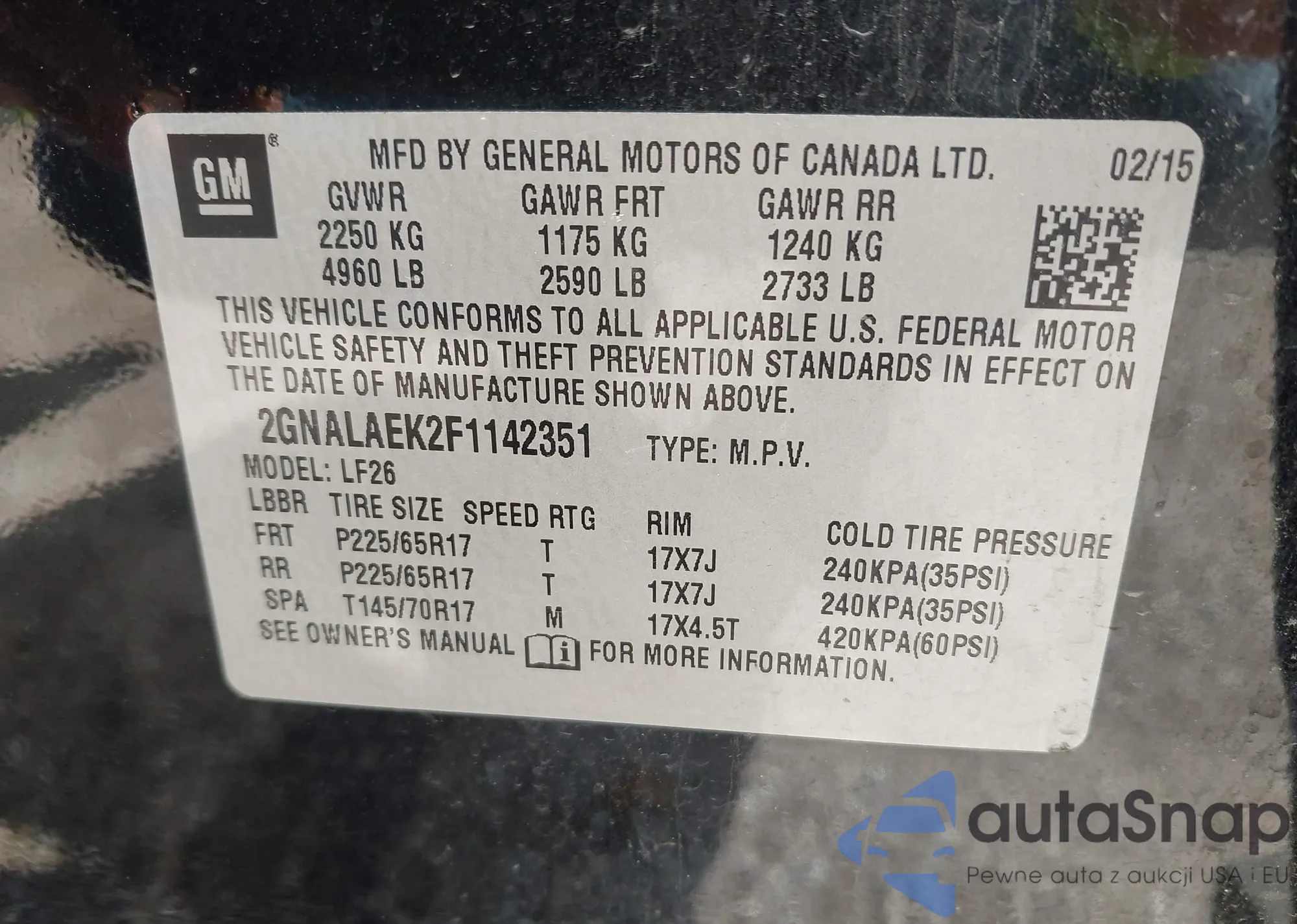 LOT: 42229280 VIN: 2GNALAEK2F1142351
