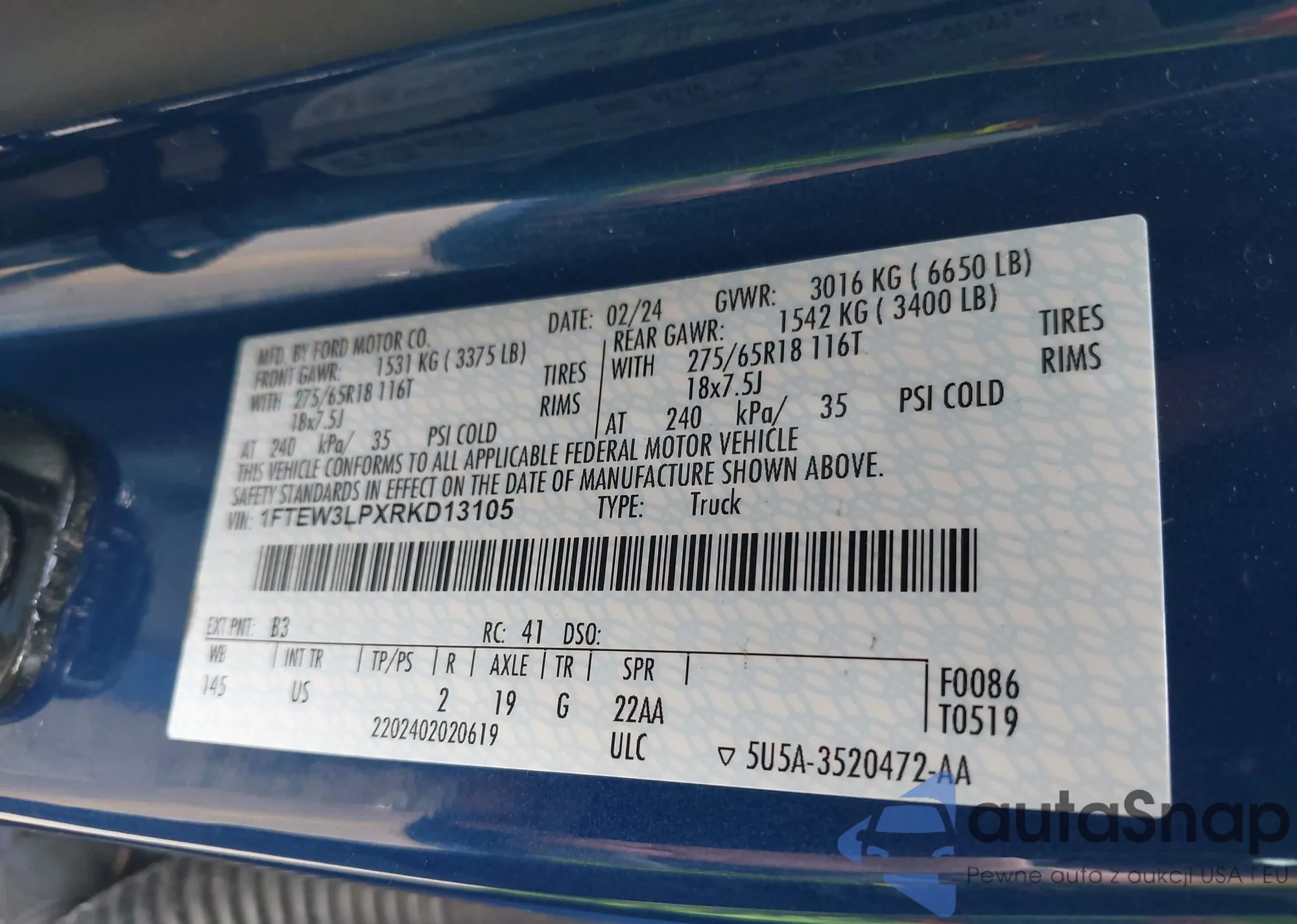LOT: 42138838 VIN: 1FTEW3LPXRKD13105