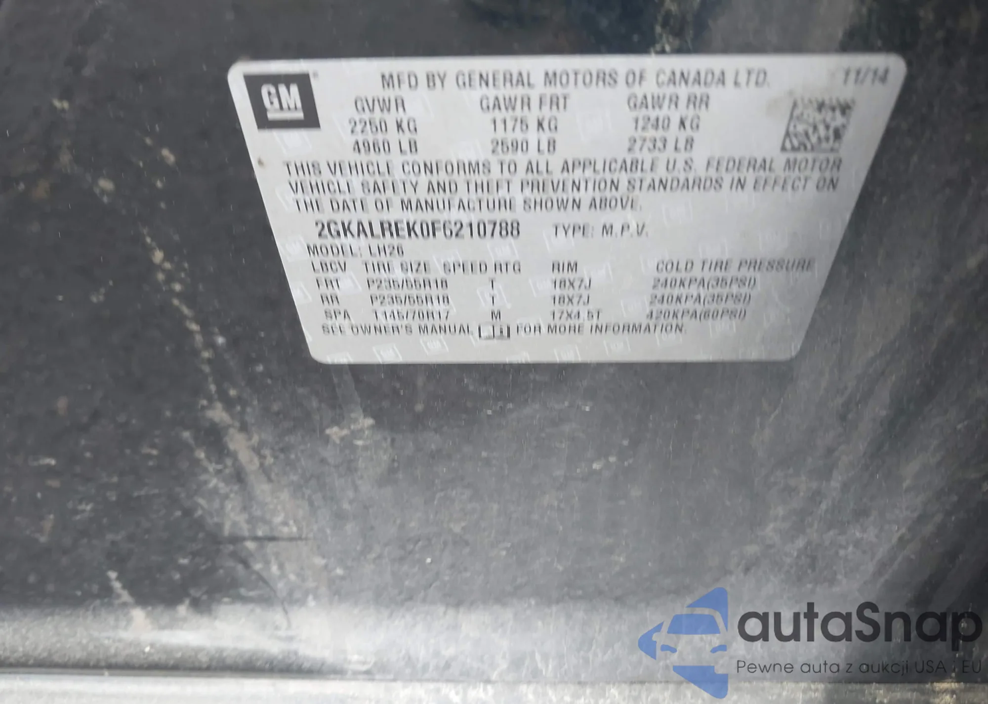 • VIN 2GKALREK0F6210788