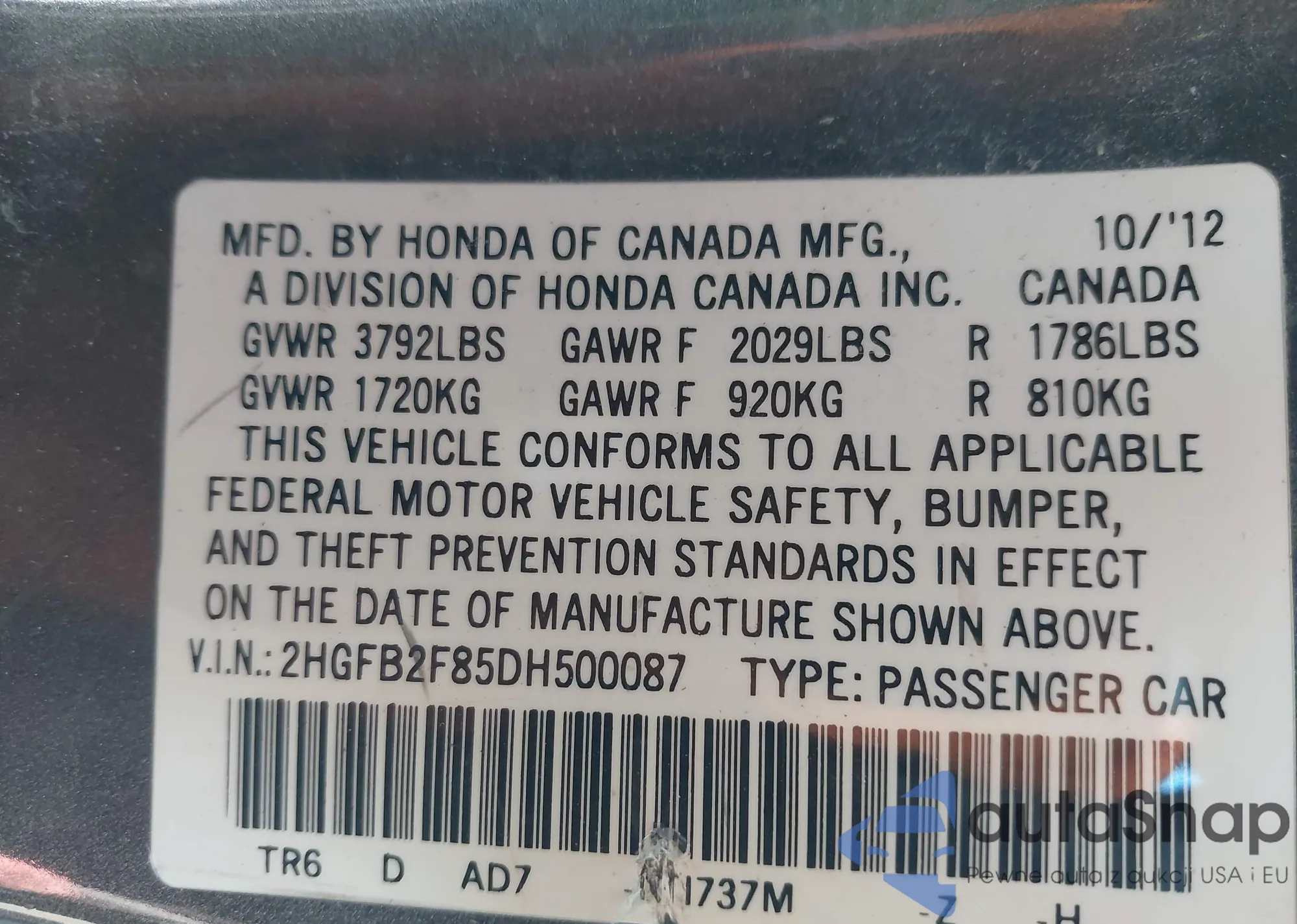 • VIN 2HGFB2F85DH500087