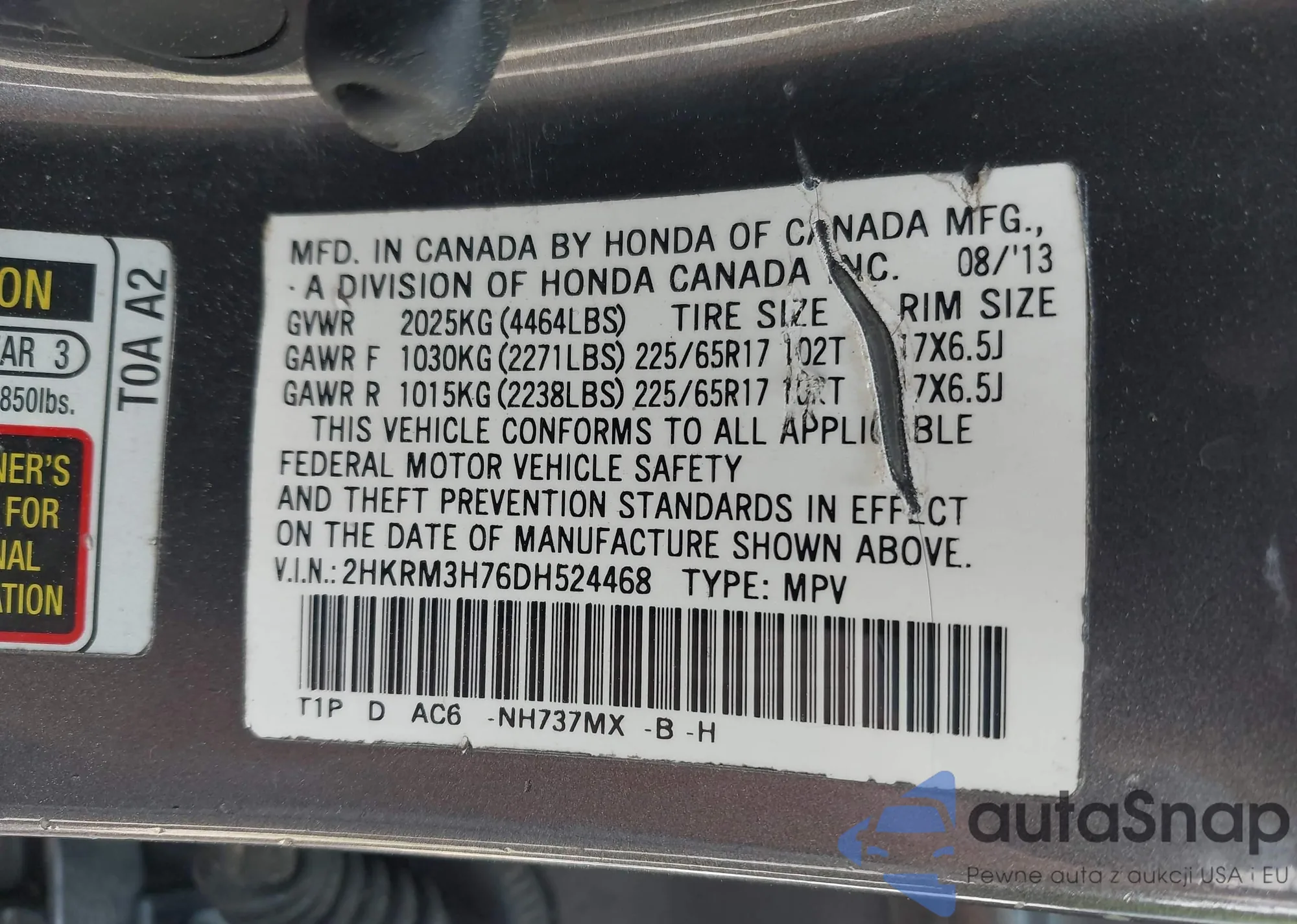 • VIN 2HKRM3H76DH524468