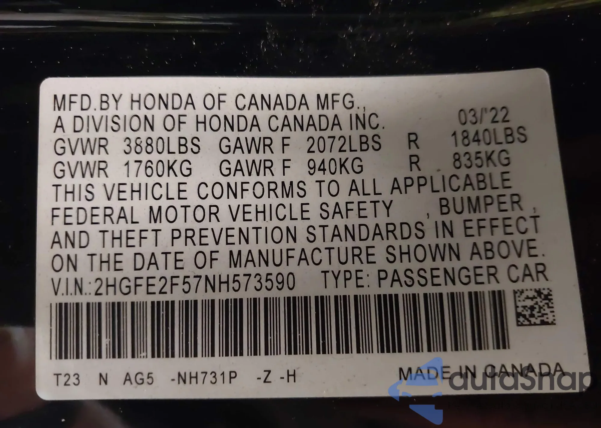 LOT: 42168244 VIN: 2HGFE2F57NH573590