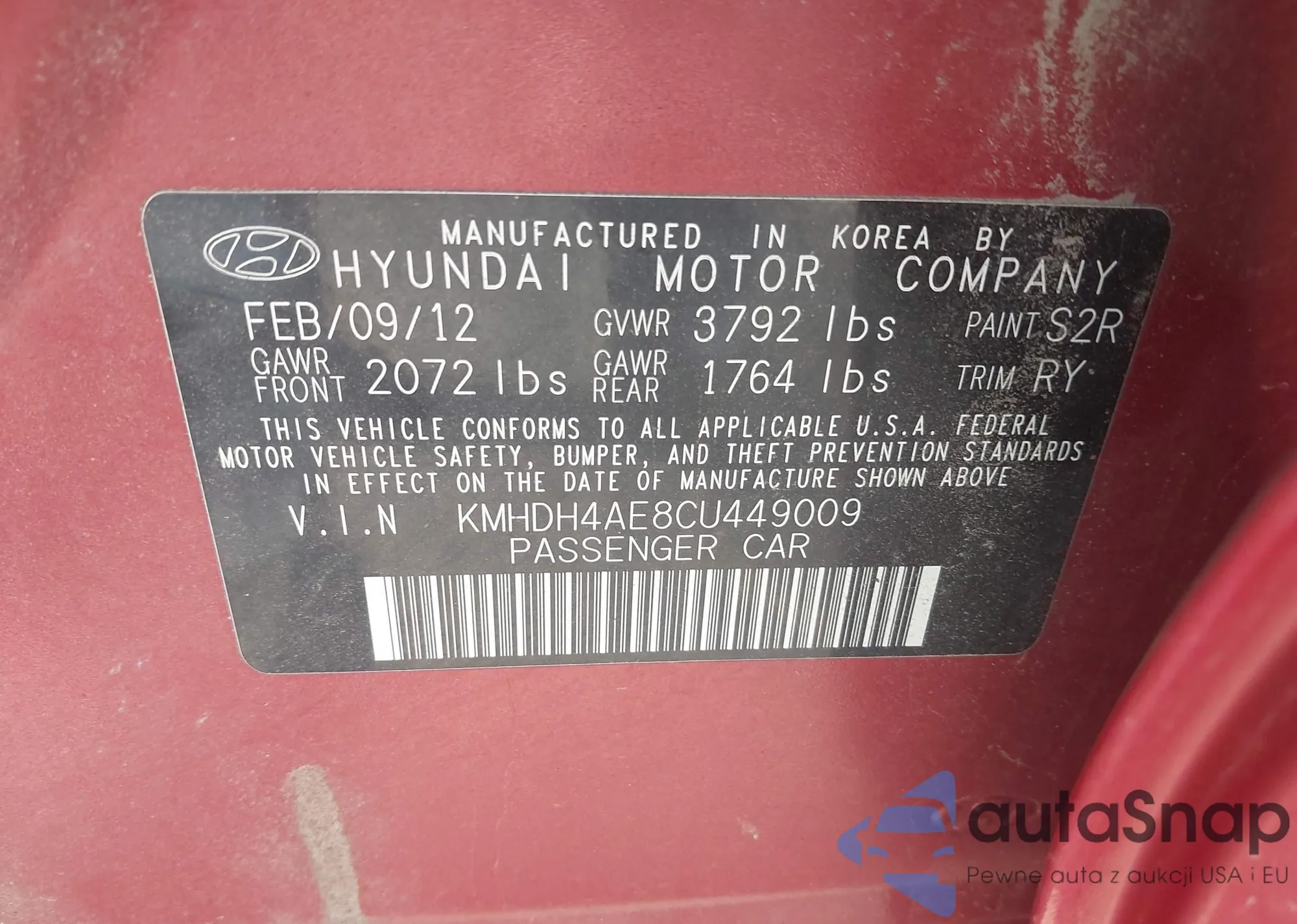 LOT: 42228159 VIN: KMHDH4AE8CU449009